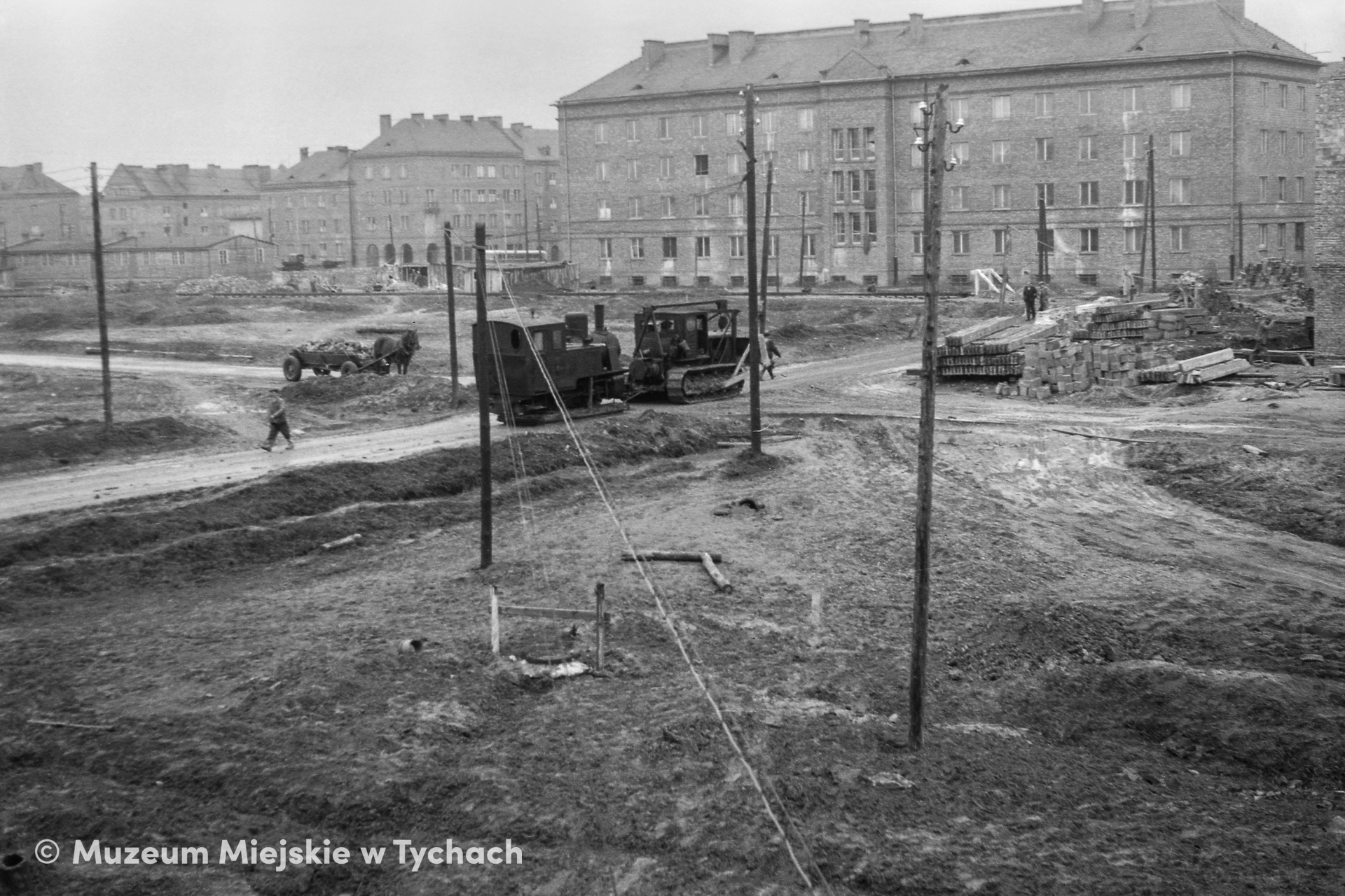 A south view of the Hotelowiec, a workers' hotel built for the city' s building workforce (currently home of the District Court in Tychy). In front of the hotel there is a disorderly area after an abandoned construction site camp with a bulldozer, a narrow-gauge locomotive and building materials all left behind. The bckground features residential buildings in Budowlanych Street.