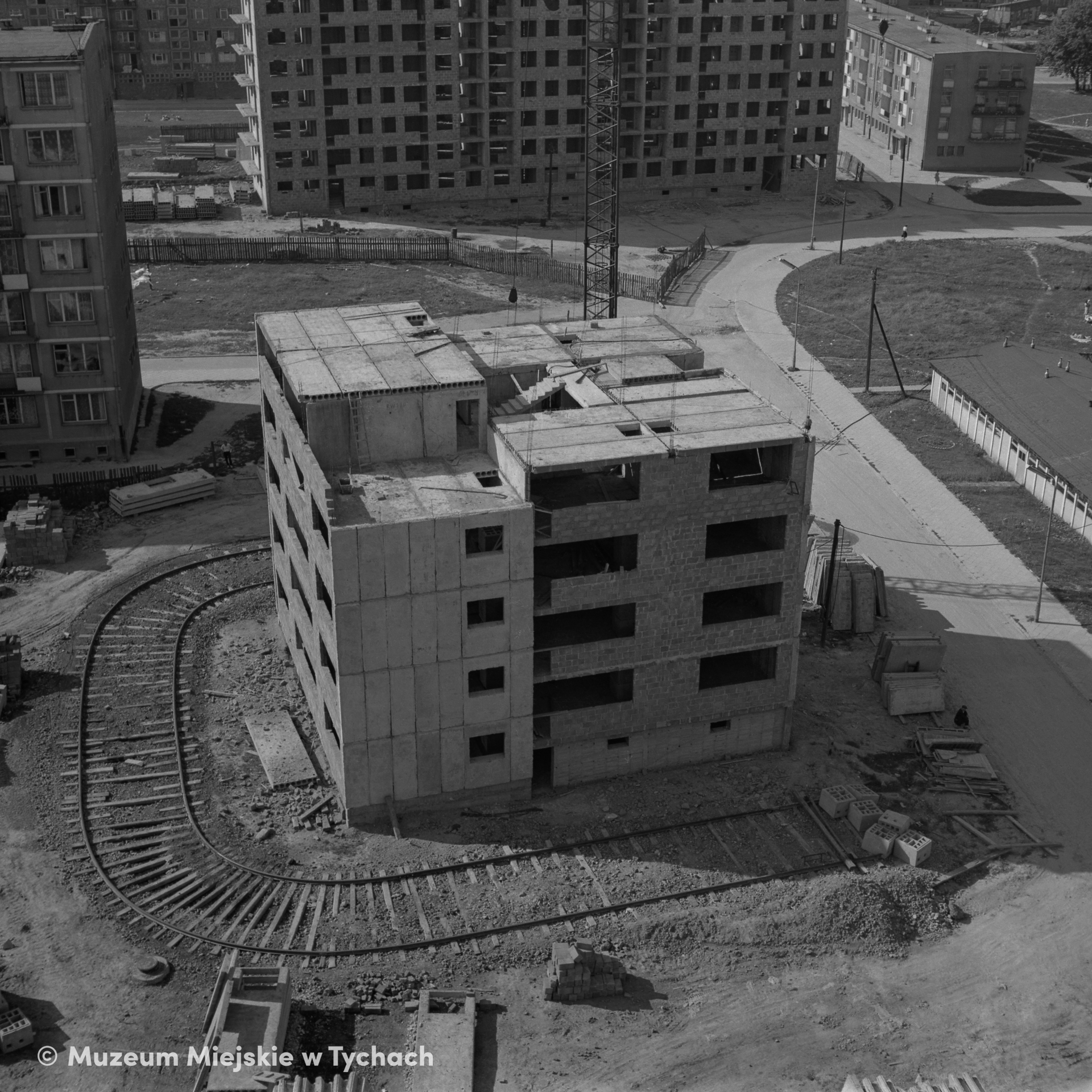 A bird's-eye view of the construction of a single-entrance residential block (a multi-storey building in which flats are located around a central staircase) in Housing Estate D's Dębowa Street.