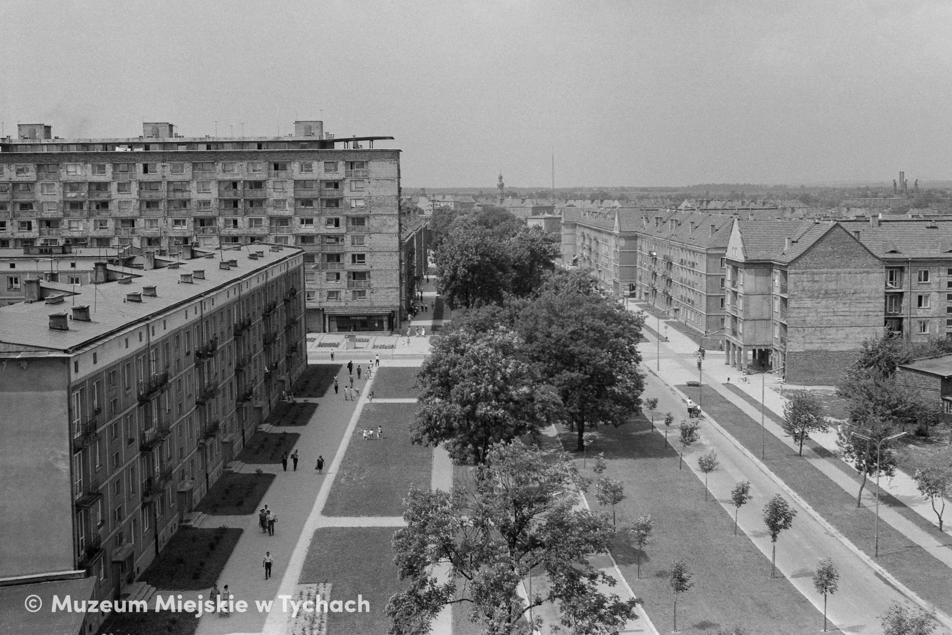 A view of a fragment of Paprocańska Street, a historical road connecting the communities of Tychy and Paprocany (Rewolucji Październikowej from 1968 to 1989, now Niepodległosci Avenue). Pictured on the right is a fragment of Housing Estate E3; on the left - a fragment of Housing Estate C2 with Tychy's first high-rise, which housed a Chełmek footwear shop on the ground floor.