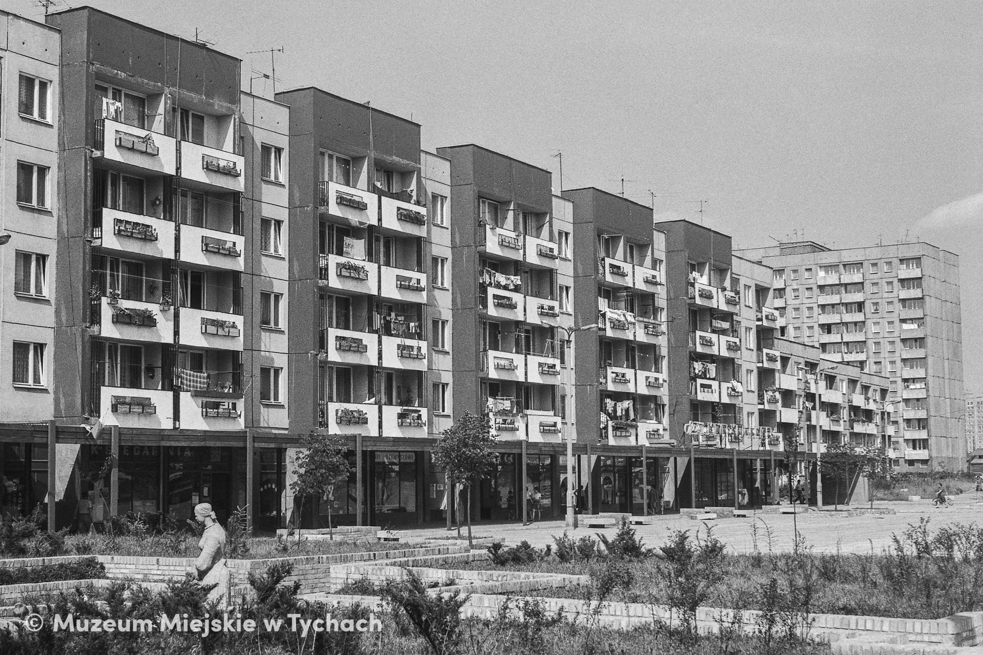 A fragment of a residential area with a low-rise block of flats (library and retail points on the ground floor). On the right there is a visible fragment of the sculpture of 'Ślązaczka Karolinka' [Karolinka the SIlesian] by Augustyn Dyrda (currently the sculpture stands on the grounds of the Janusz Makuszyński Primary School No. 37; a new sculpture of "Karolinka" by Tomasz Wenklar is on display near the original location of its predecessor.