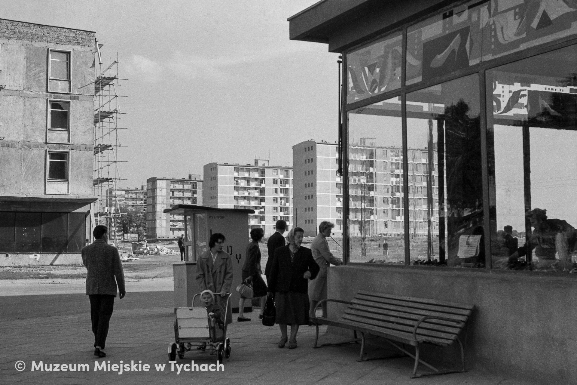 A view from Housing Estate C's Cyganerii Street onto Feliksa Dzierżyńskiego Street (now Grota Roweckiego Street). In the background, there are residential blocks in Housing Estate D1's Dębowa Street. The building on the left housed a self-service grocery shop in the 1960s and, from the early 1970s, a confectionery shop called Cukierenka. On the right, a fragment of the footwear shop window.