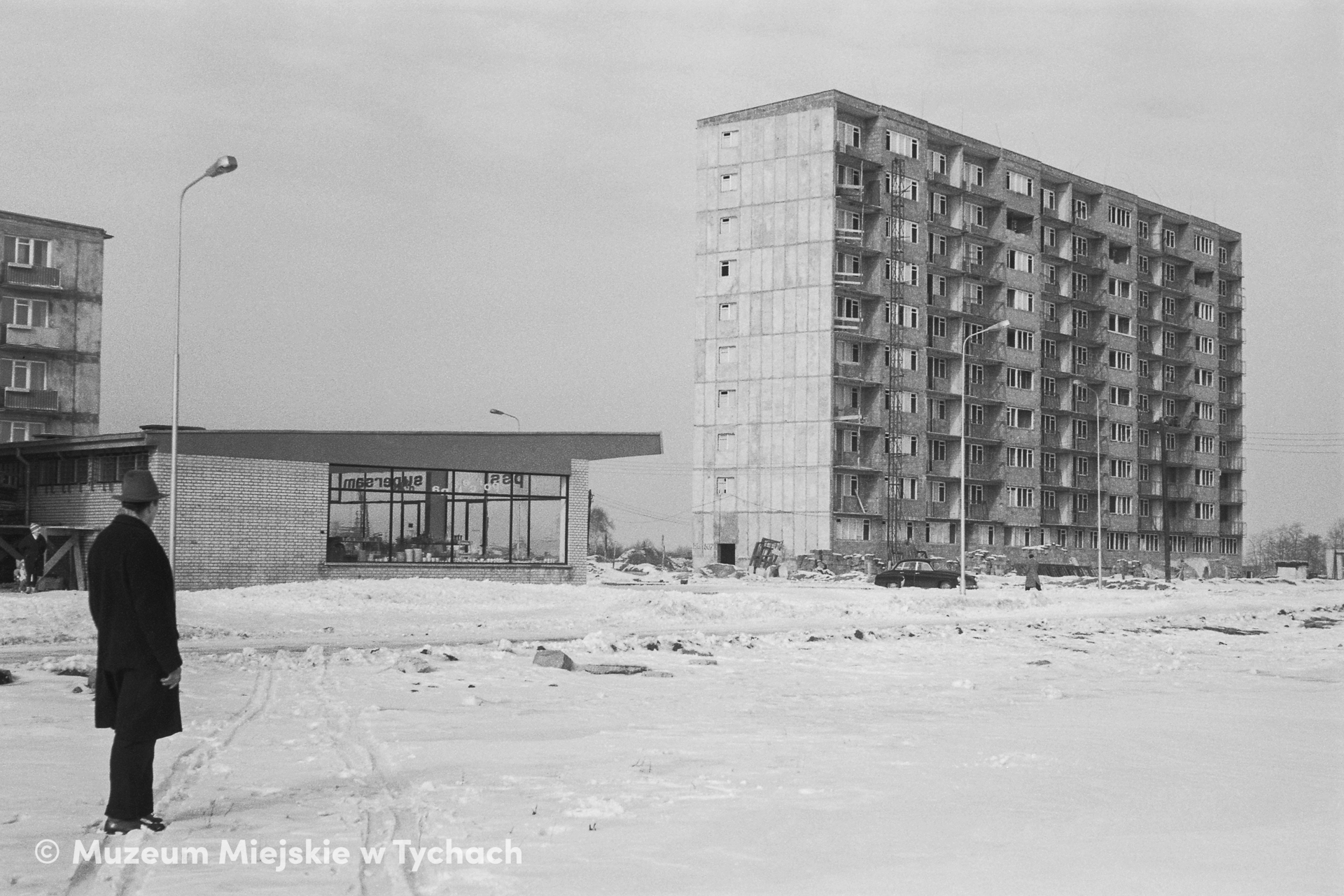 A man looks towards a nine-storey residential block in Oskara Langego Street (now Hanny i Kazimierza Wejchertów Street). Shown on the left is a fragment of Małgorzaty Fornalskiej Street now kardynała Stefana Wyszyńskiego Street) with a four-storey residential block and a retail pavilion operated by Powszechna Spółdzielnia Spożywców Społem (Consumers' Co-operative).