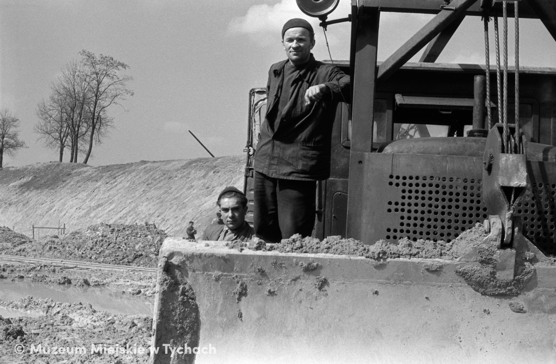 A break from work on the construction of a railway trench: builders on a bulldozer.