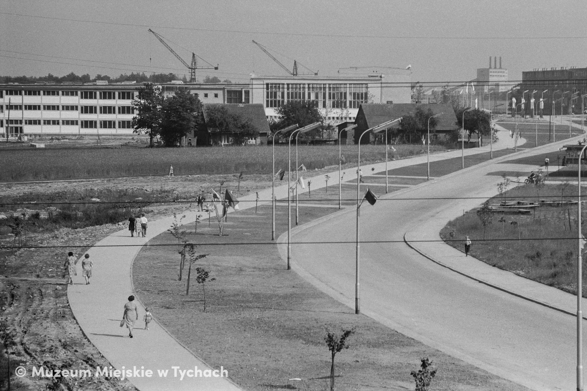 A view of the boarding house and the sports hall of the Stefan Franciszak Secondary School of Building Technology and the Building Crafts School (now School Complex No. 5). Shown in front of the school buildings are some old rural houses. On the right, a fragment of a residential block in Fryderyka Engelsa Street (now Edukacji Street). A CHP plant can be seen in the distance.