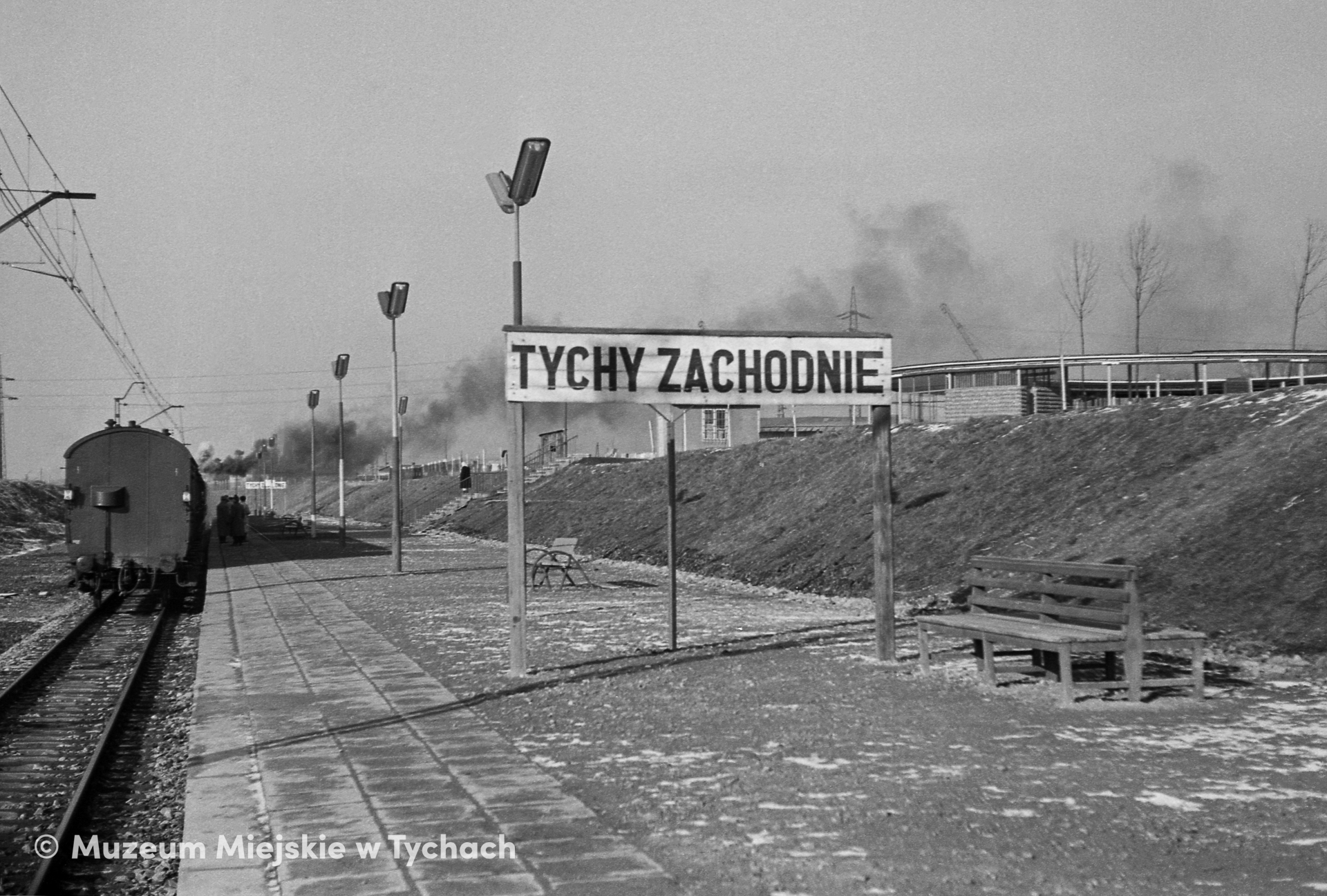 Tychy Zachodnie railway station; a platform in a trench. Standing by the platform, despite the line being electrified, is a train with a steam engine.