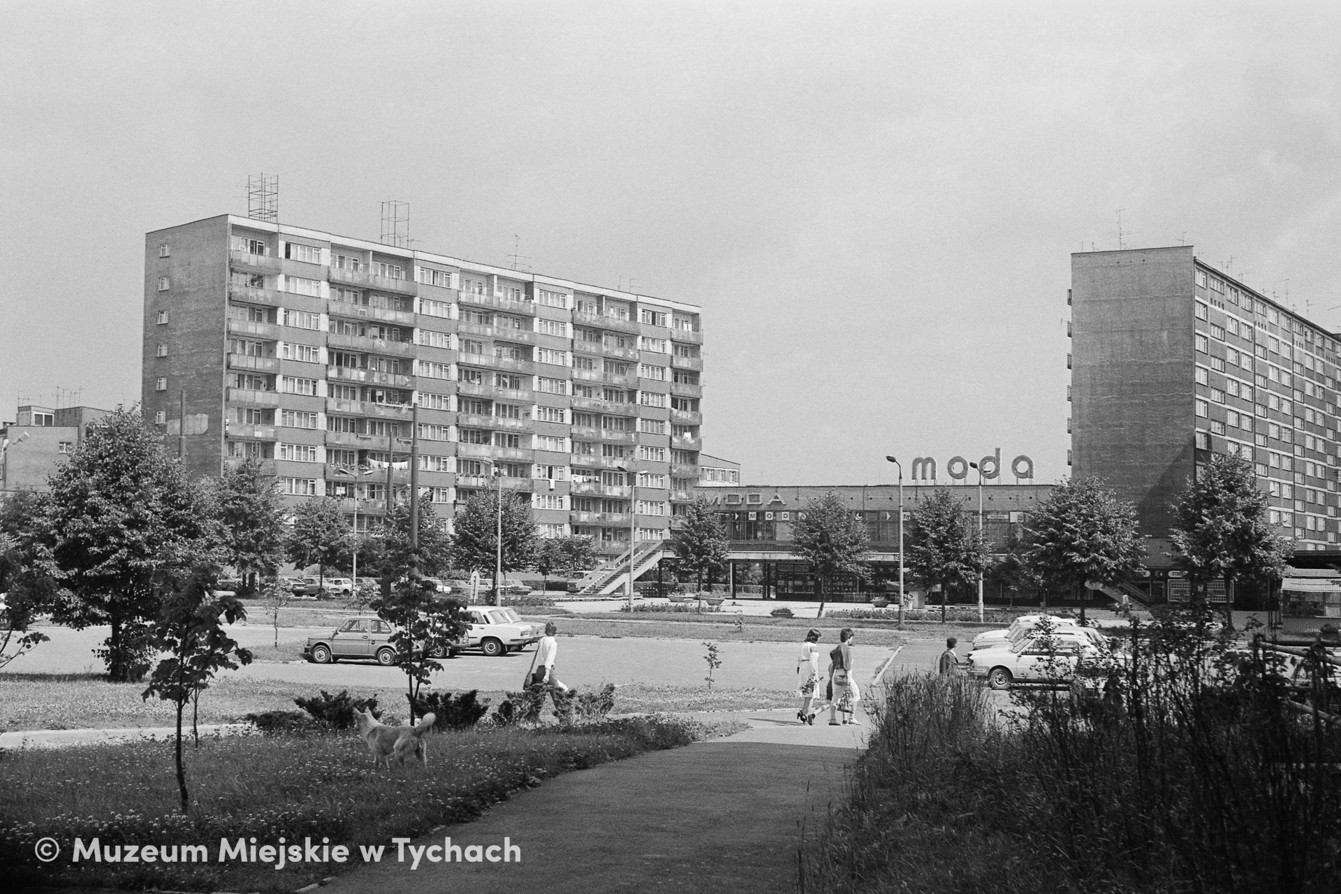 A view of a shopping pavilion in housing estate F and the adjacent multi-storey residential blocks. On the first floor of the pavilion, there was the Moda fashion boutique, designed by Maria and Andrzej Czyżewski with Kazimierz Wejchert.