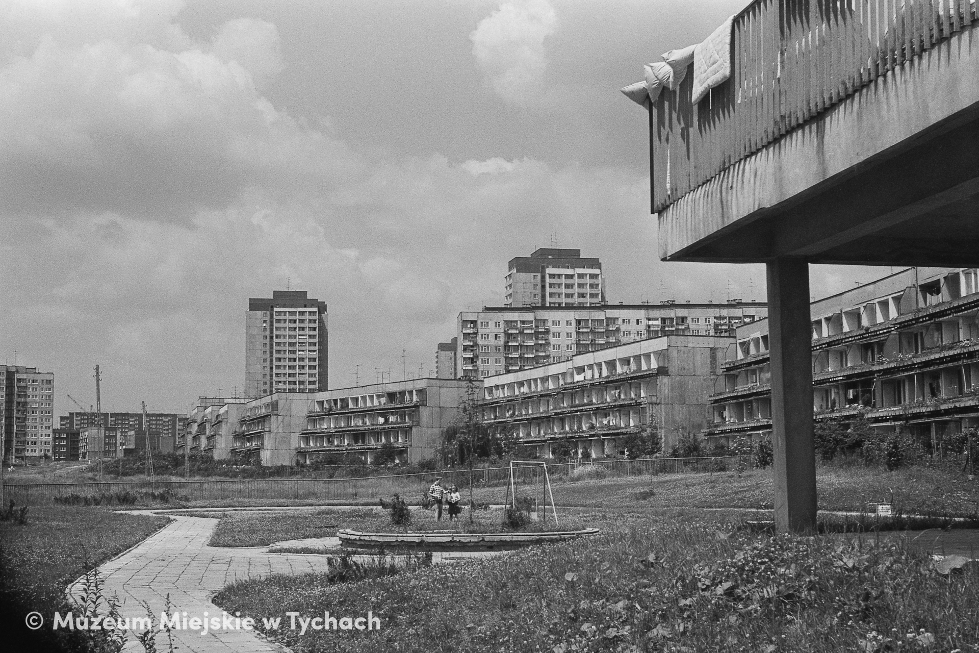 A view from a nursery garden of terraced residential blocks, with children playing in the garden. Pictured in the background are fragments of Housing Estates O and N.