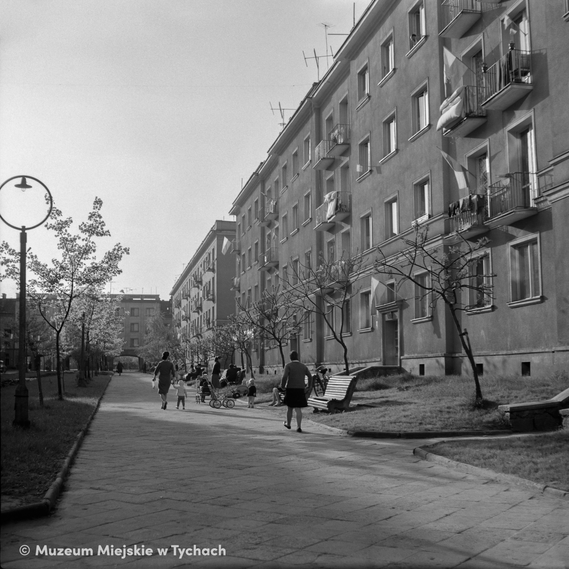 Residents in Housing Estate A in front of residential blocks in Wincentego Pstrowskiego Street (the estate's central thoroughfare). In the background, there are arcades leading to Wincentego Pstrowskiego Square (formerly Józefa Stalina Square, now St. Anne's Square). National flags are displayed in several windows. The photo was probably taken on the eve of Labour Day.