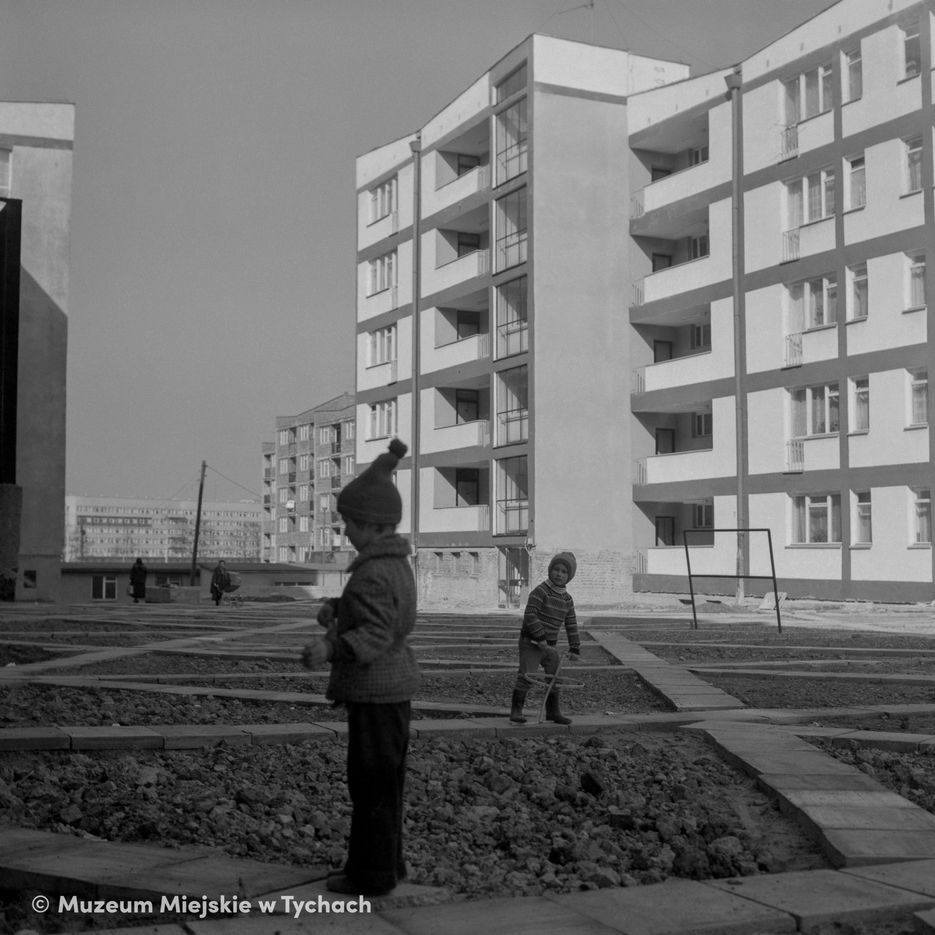 Children playing in the square between four-storey buildings in Housing Estate G.