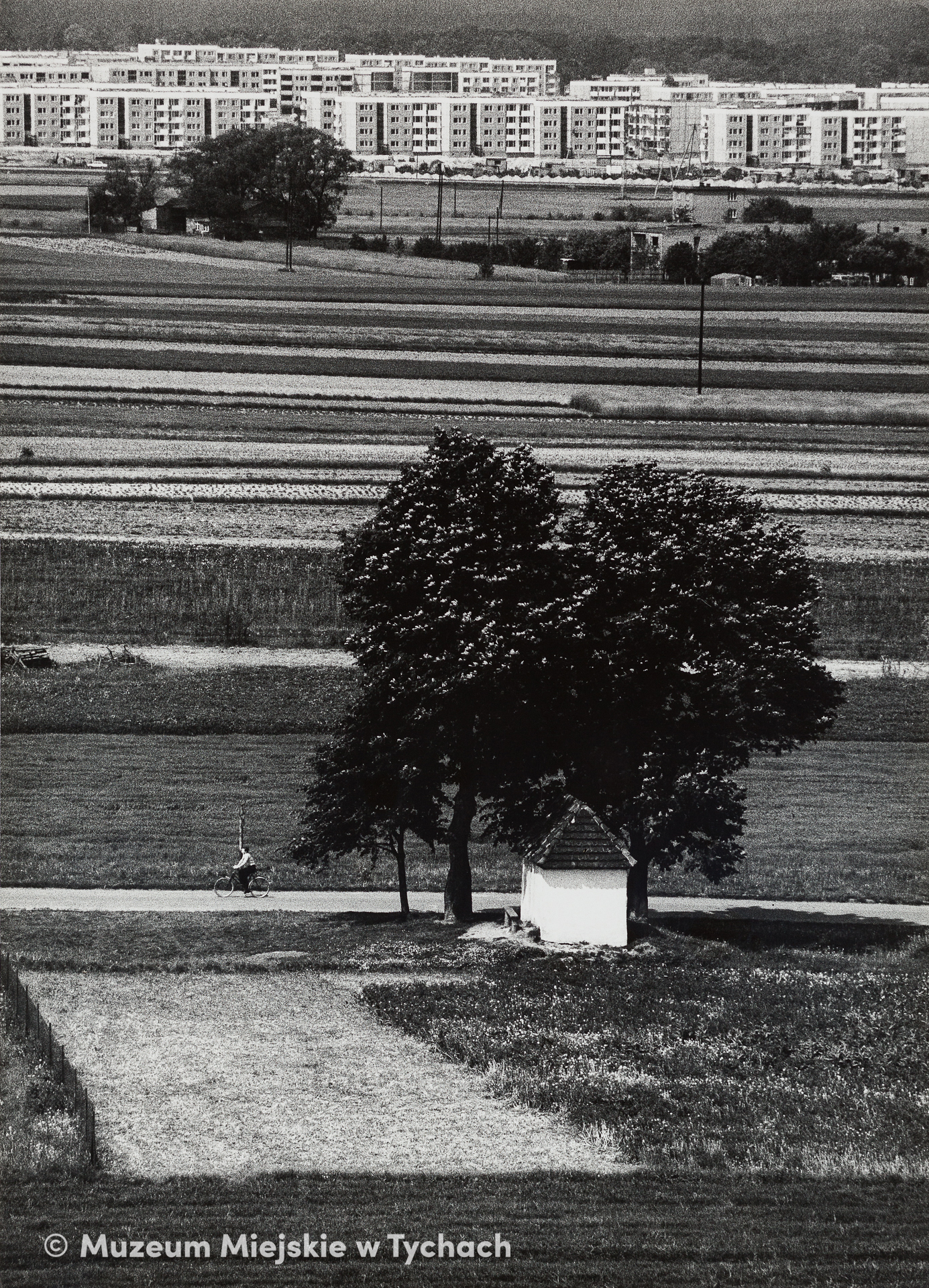Widok z wieży triangulacyjnej na kapliczkę św. Tekli w Cielmicach (od 1973 roku dzielnica Tychów) i rozpościerające się dookoła pola z pojedynczymi domami. Nieopodal kapliczki jedzie na rowerze mężczyzna. W oddali osiedle Z i las. Tytuł odautorski „Kapliczka”.