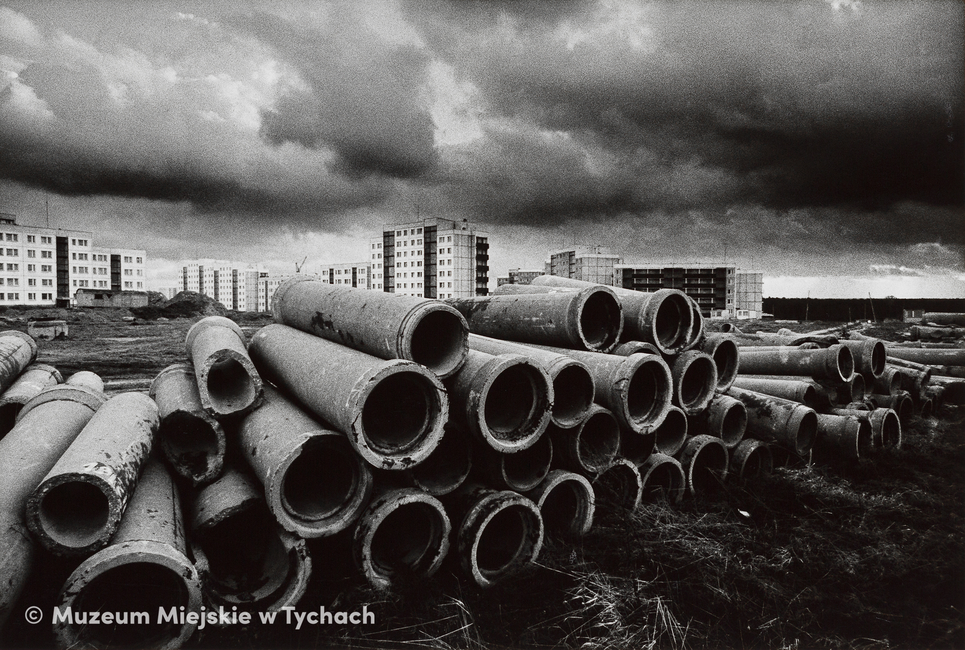 Materiały instalacyjne (rury) na niezagospodarowanych terenach w sąsiedztwie osiedla U. W tle widać zabudowania osiedla.