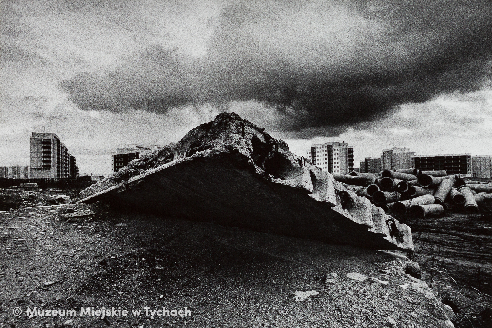 Elementy prefabrykowane niszczejące na niezagospodarowanych terenach. W tle widok na osiedle U.