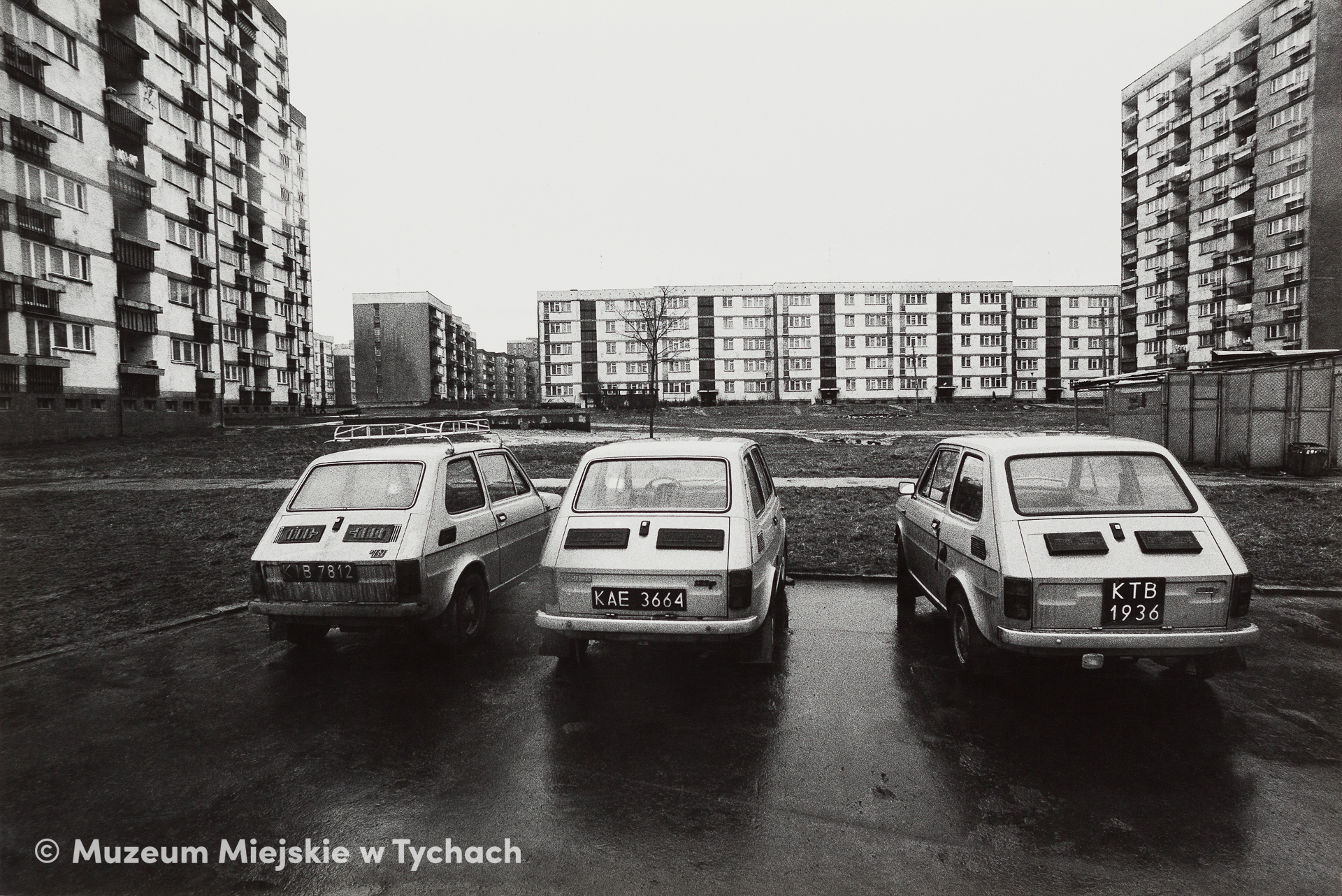 Na pierwszym planie trzy fiaty 126p na parkingu przy osiedlu M. Po prawej i lewej stronie wielokondygnacyjne budynki mieszkalne, na wprost czteropiętrowy budynek mieszkalny przy ulicy Karola Marksa (obecnie Aamadeusza Mozarta). Tytuł odautorski „Tyski pejzaż III”.