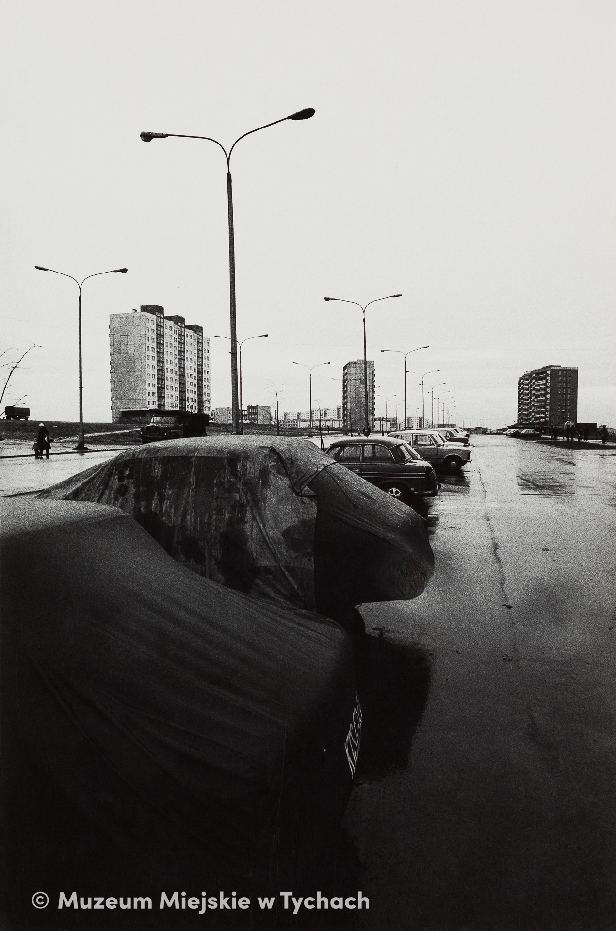 Samochody na parkingu przy ulicy Aleksandra Zawadzkiego (obecnie Romana Dmowskiego) – na pierwszym planie dwa pojazdy w pokrowcach ochronnych. W oddali wieżowce na osiedlach N i M.
