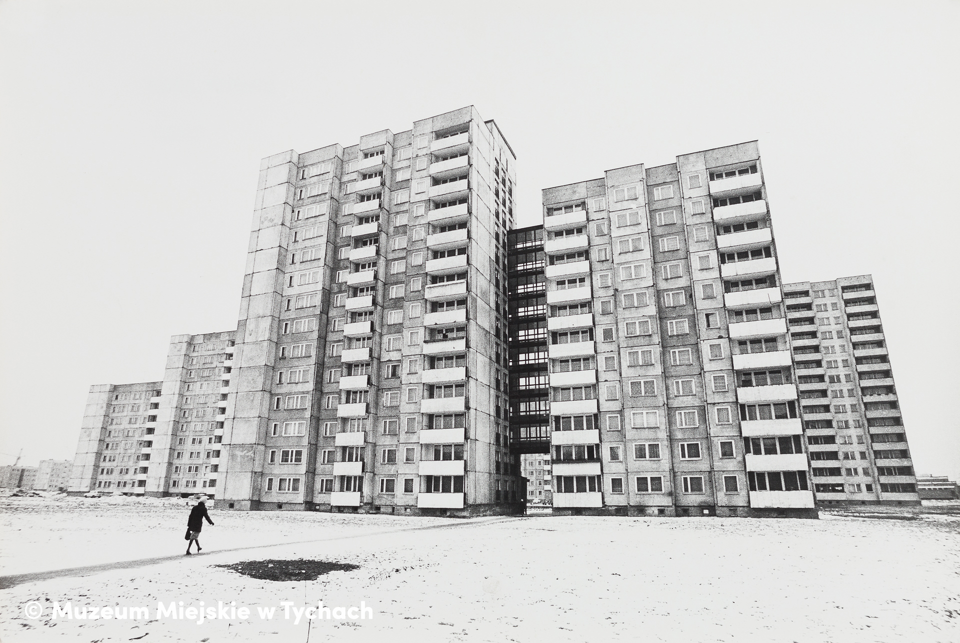 Kobieta idzie wydeptaną w śniegu ścieżką w kierunku jednego z wielokondygnacyjnych budynków mieszkalnych na osiedlu H4. Całościowy projekt osiedla H przygotował Janusz Włodarczyk we współpracy z Hanną Adamczewską-Wejchert i Kazimierzem Wejchertem. Tytuł odautorski „Moje osiedle I”.