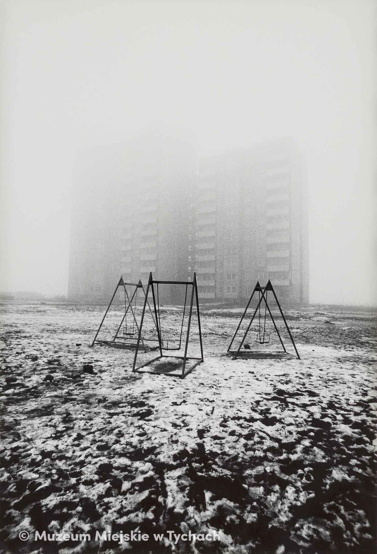 Na pierwszym planie znajdują się trzy metalowe huśtawki, tworzące plac zabaw na osiedlu H4. W tle widać wielopiętrowy budynek mieszkalny, częściowo we mgle. Zdjęcie wykonane zimą. Całościowy projekt osiedla H przygotował Janusz Włodarczyk we współpracy z Hanną Adamczewską-Wejchert i Kazimierzem Wejchertem. Tytuł odautorski "Hustawki".
