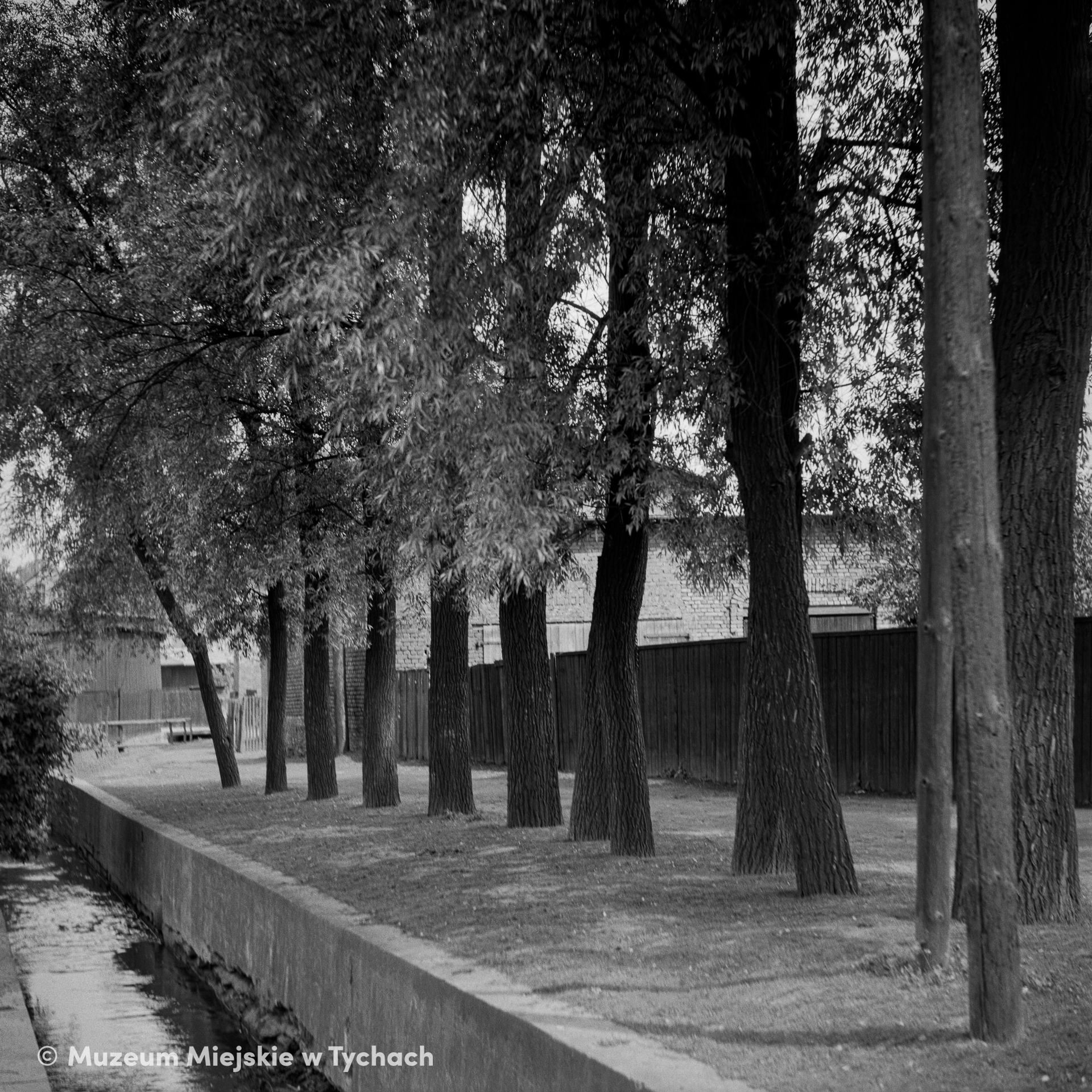 Widok od zachodu na fragment Potoku Tyskiego. Uregulowane koryto obsadzone drzewami biegnie między budynkami jednorodzinnymi i gospodarczymi wzdłuż ulicy Kościuszki. Za drzewami drewniane ogrodzenie.
