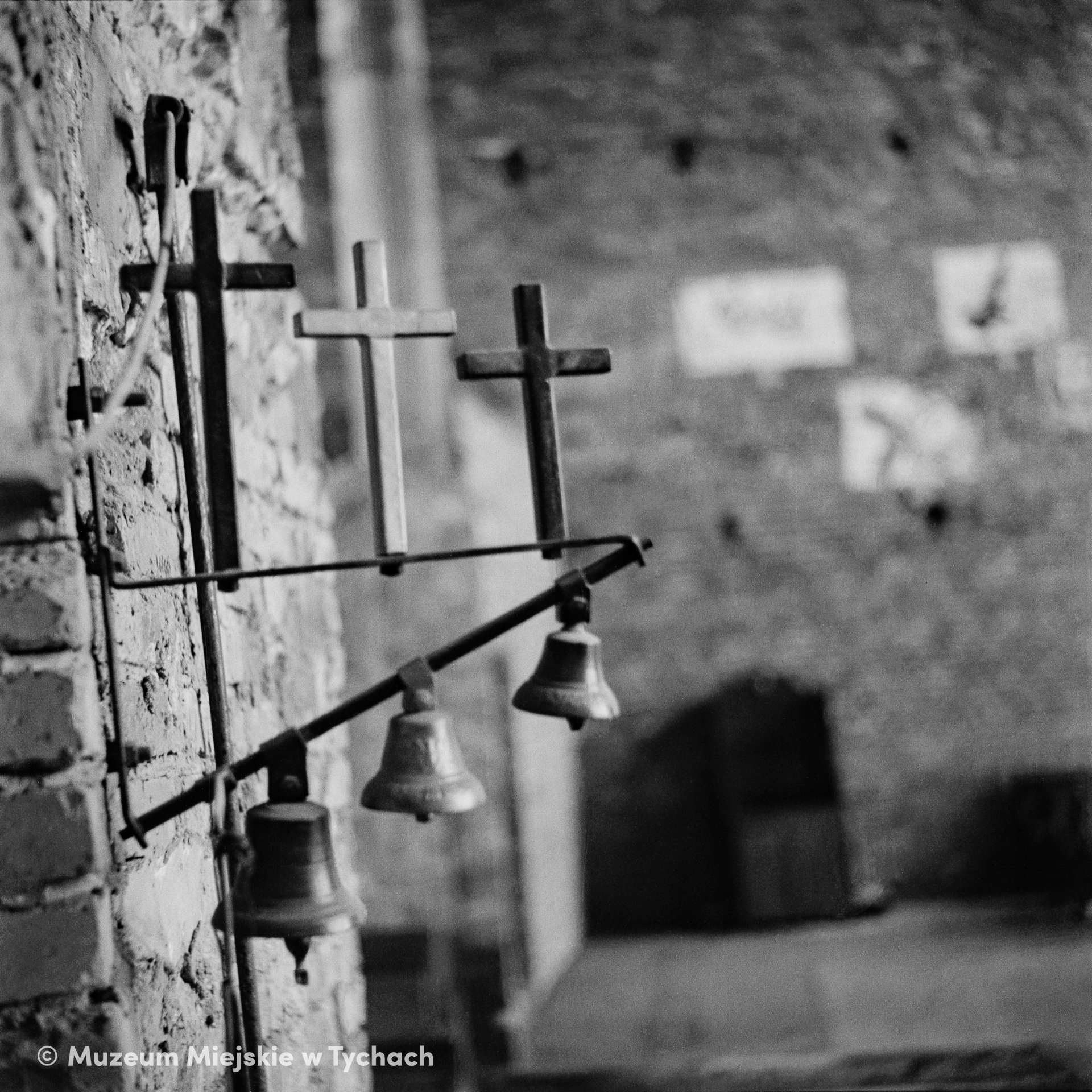 Wnętrze kościoła pw. św. Jana Chrzciciela. Dekoracja z metaloplastyki z dzwonkami i sygnaturkami na ścianie w pobliżu przejścia z zakrystii do prezbiterium.