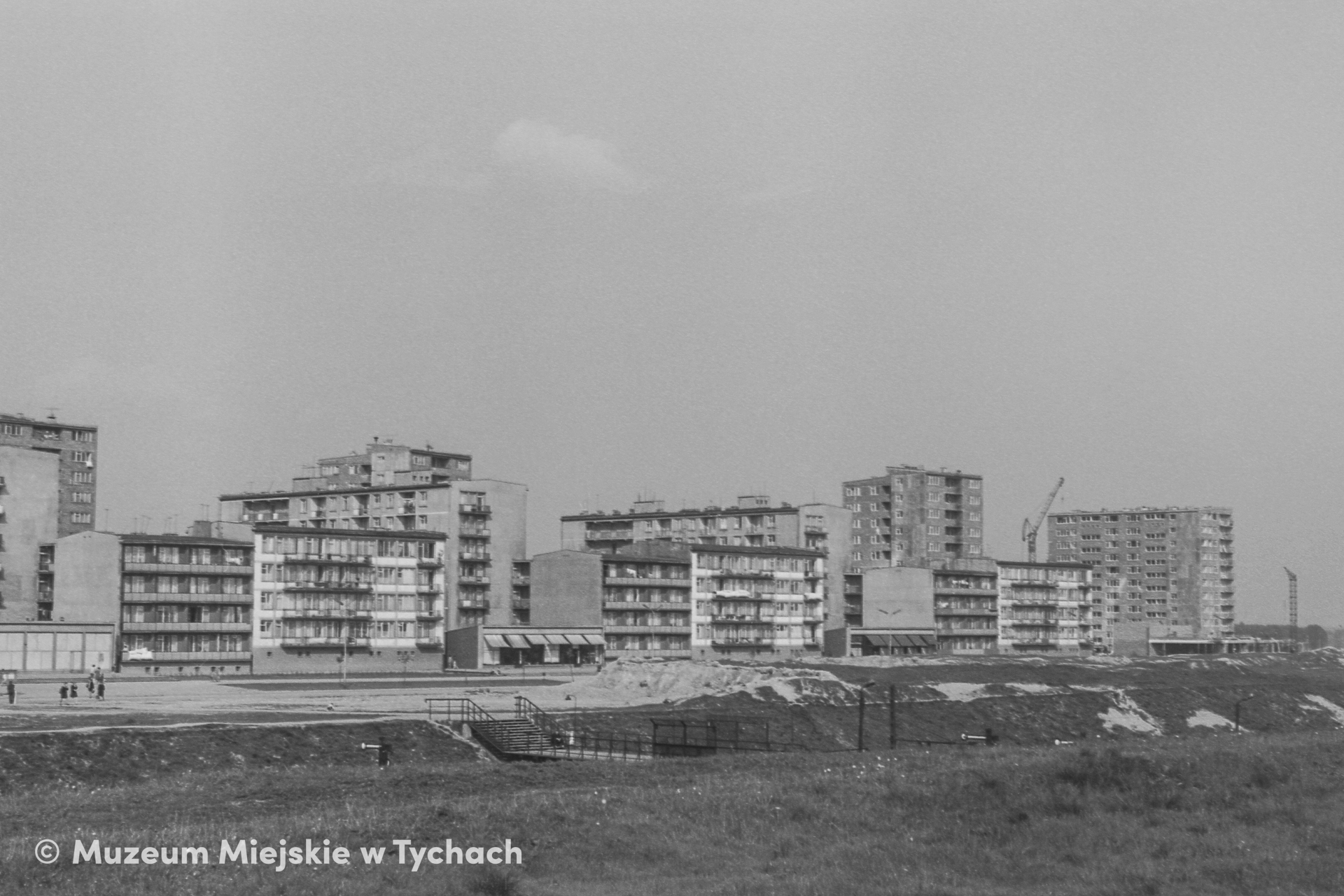 Budynki mieszkalne i pawilony handlowe wzdłuż ulicy Jarosława Dąbrowskiego (obecnie Henryka Dąbrowskiego), przed nimi wykop kolejowy z zejściem na peron. Widok od północnego zachodu.