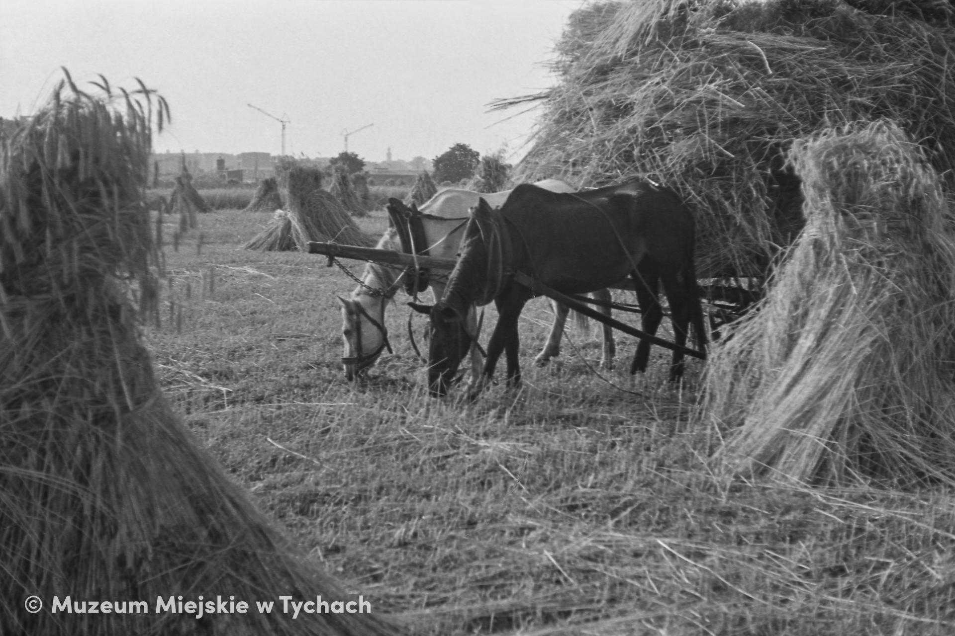 Widok od wschodu na pola uprawne na terenie przyszłego Parku Miejskiego. Konie zaprzęgnięte do wozu wypełnionego zebranym zbożem. W głębi zabudowa osiedli D i C.