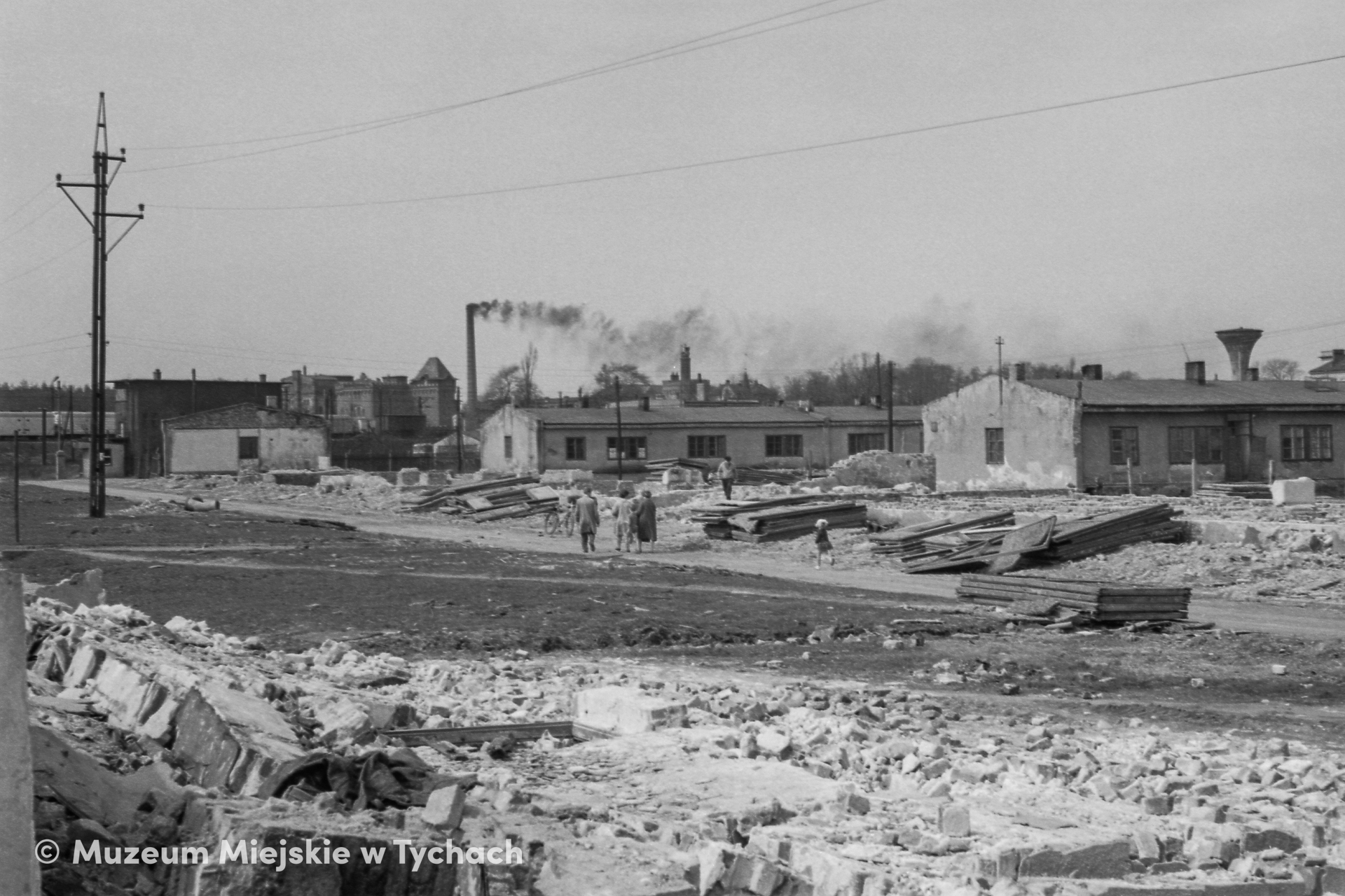 Rozbiórka miasteczka barakowego usytuowanego w pobliżu osiedla A, wzdłuż Potoku Browarnianego. Służyło ono jako pierwszy hotel robotniczy dla pracowników budujących miasto oraz ich rodzin. W głębi zabudowania Browaru Obywatelskiego. Widok od południowego wschodu.