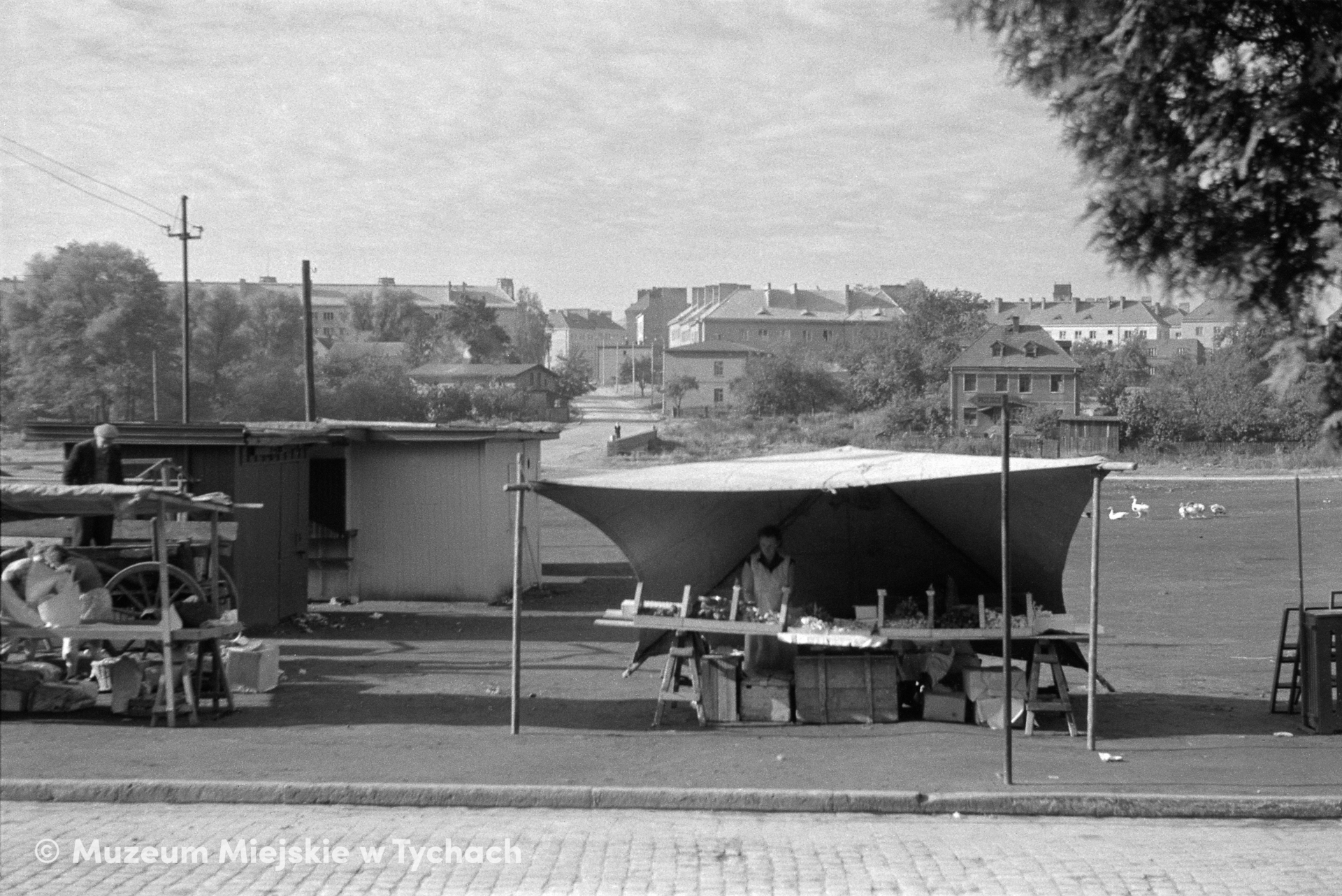 Stragany na placu przed kościołem św. Marii Magdaleny (obecnie Rynek). W głębi widać osiedle B w pobliżu ulicy Mariana Buczka (obecnie o. Innocentego Bocheńskiego) z fragmentami starej zabudowy.