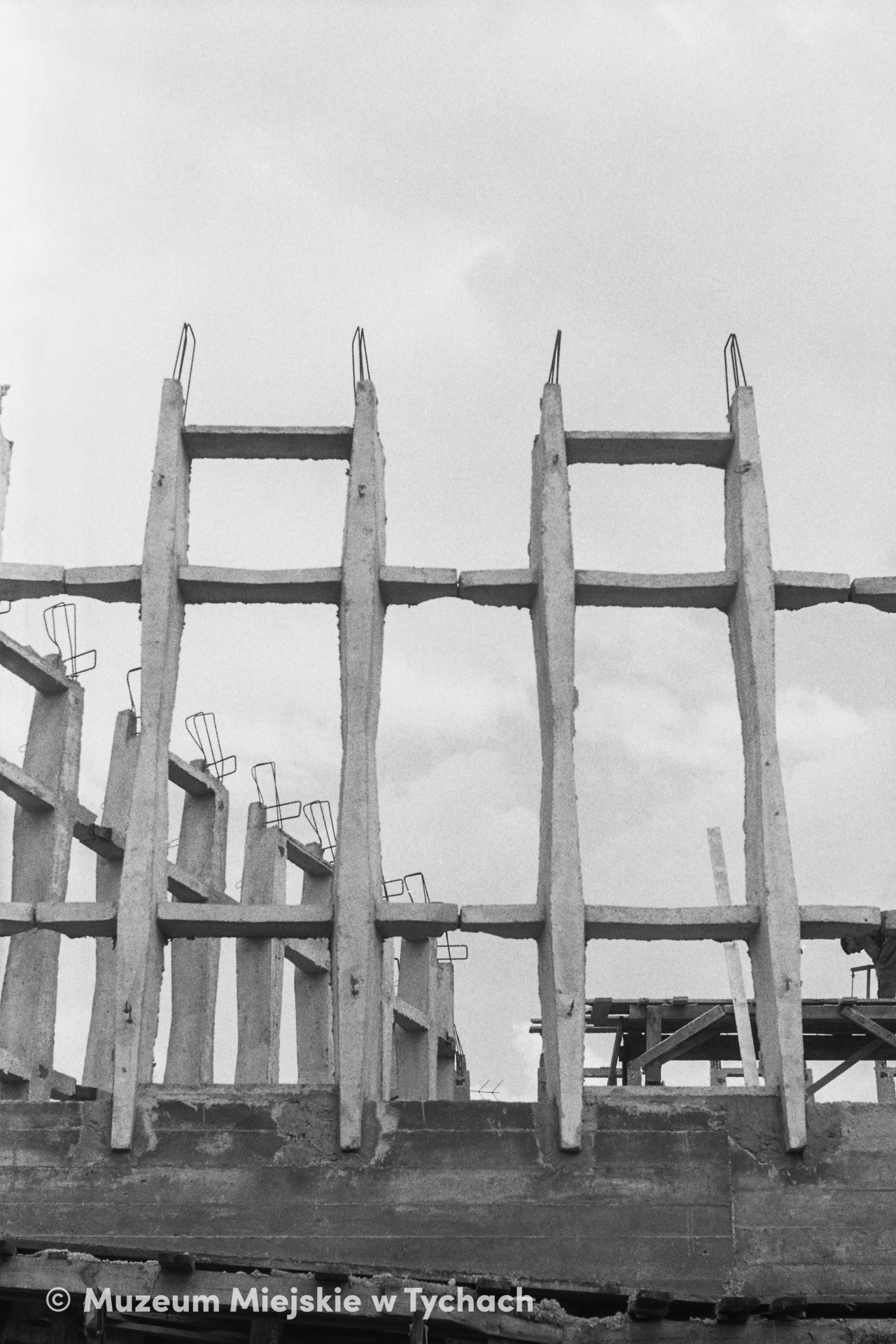 Fragment konstrukcji szkieletowej budynku Górniczego Klubu Technika NOT. W projekcie zastosowano elementy prefabrykowane, m.in. widoczne ramki „H”.