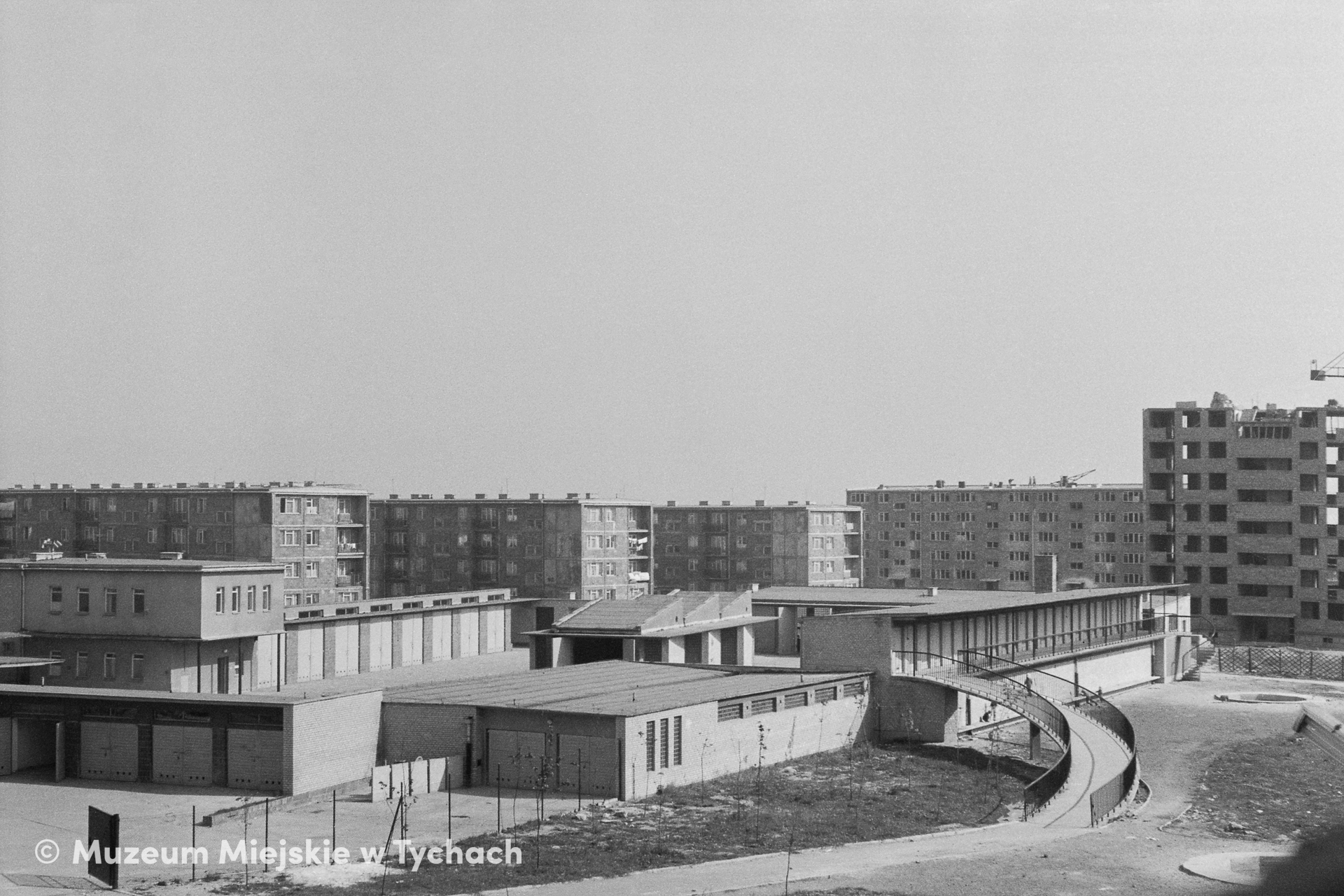 Widok na budynki Powiatowej Kolumny Transportu Sanitarnego i Pogotowia Ratunkowego w Tychach oraz budujące się osiedle F4.