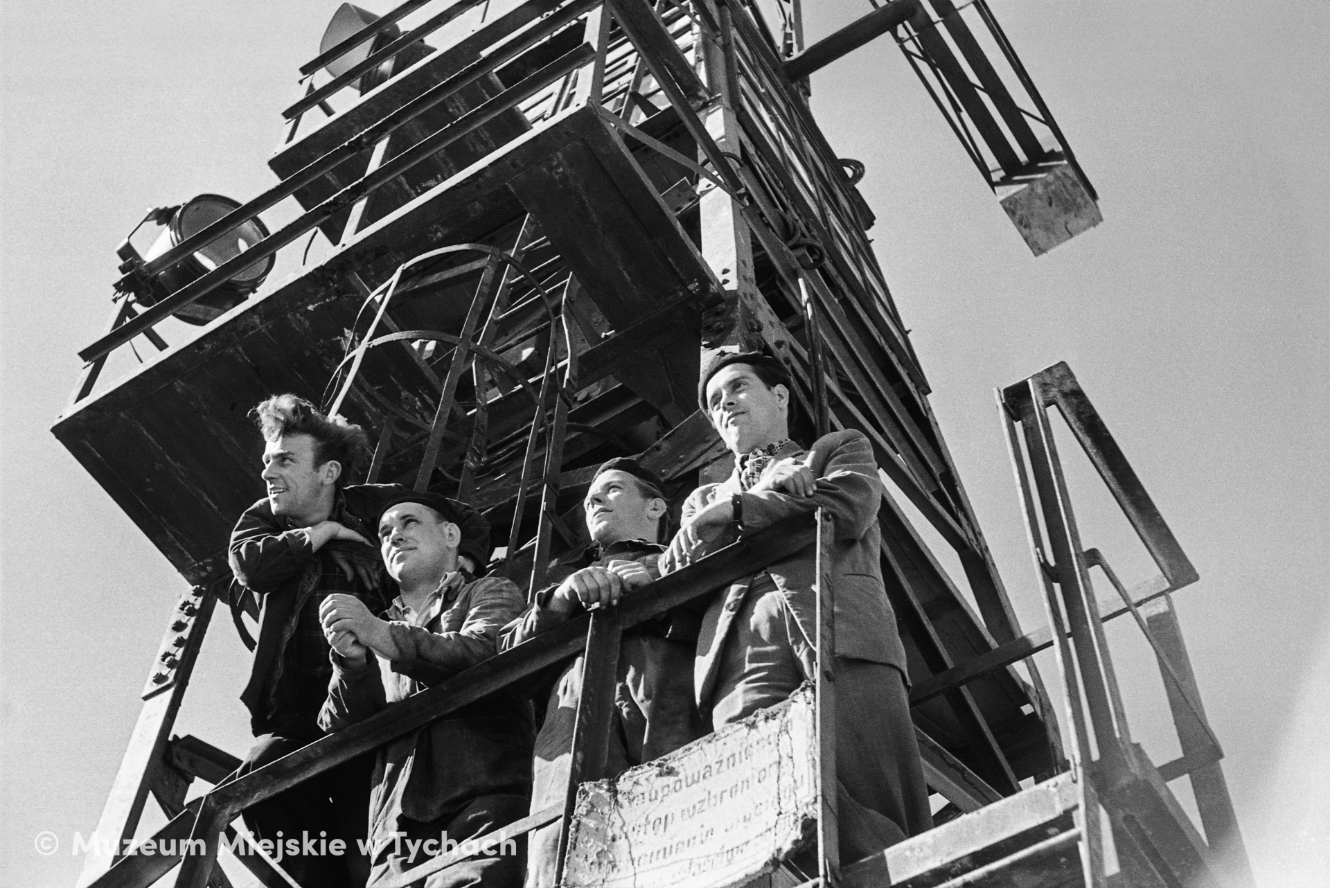 Budowlańcy na platformie dźwigu, zdjęcie wykonane przy montażu elementów prefabrykowanych.