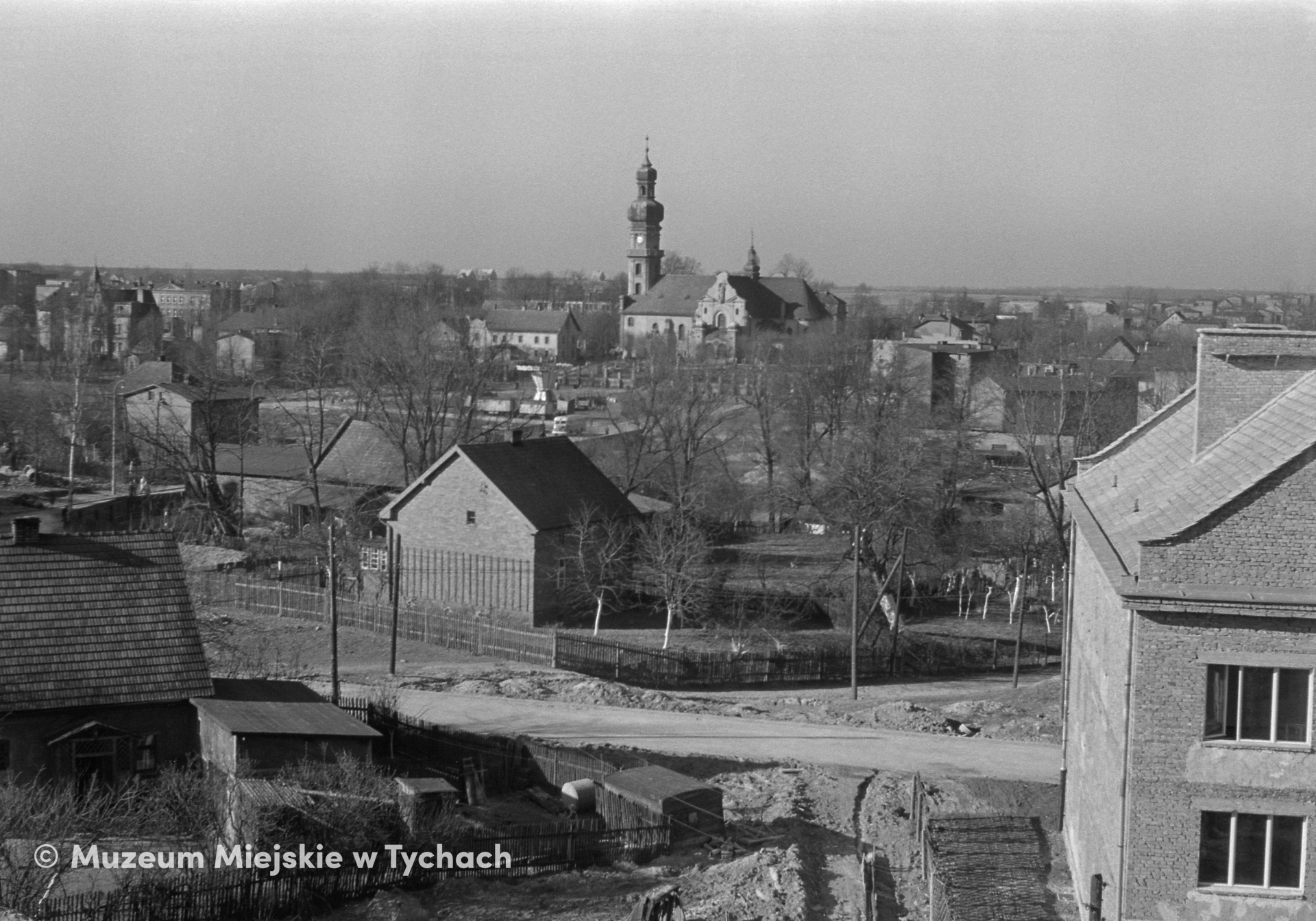 Zabudowa Starych Tychów, w głębi kościół św. Marii Magdaleny. Widok z wznoszonego budynku przy placu Bolesława Bieruta (obecnie Krzysztofa Kamila Baczyńskiego).
