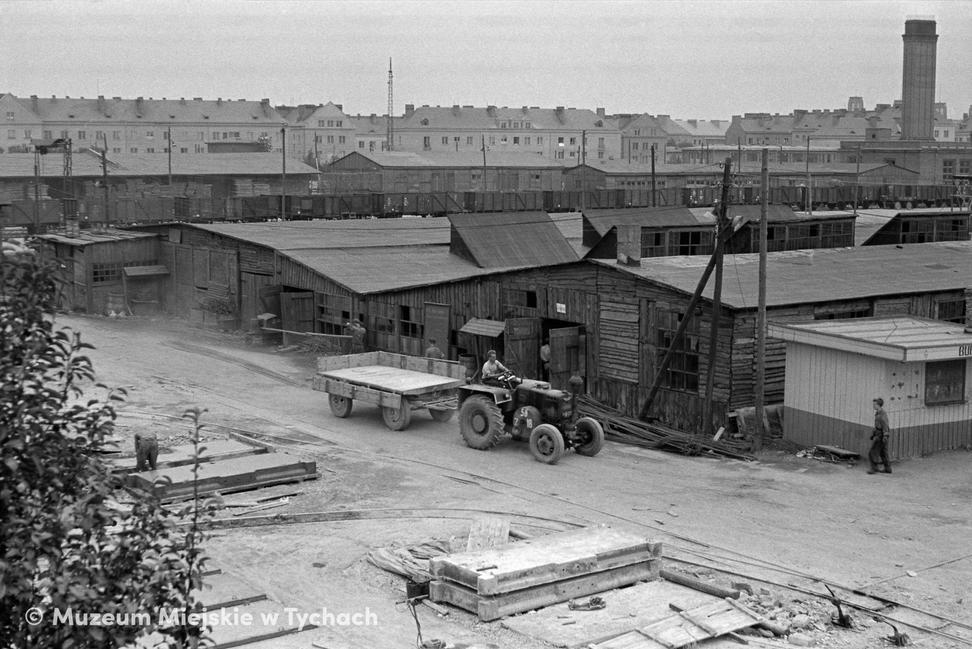 Fragment zakładu prefabrykacji: barak zbrojarni, kiosk BUFET NR 3 dla pracowników, na terenie obecni pracujący robotnicy. Przed barakiem zbrojarni ciągnik URSUS C-45 wykorzystywany do przewozu materiałów budowlanych. Między barakami linia kolejowa z wagonami towarowymi do transportu węgla i innych materiałów oraz lokalna kotłownia. W głębi budynki mieszkalne wzdłuż ulicy Budowlanych.