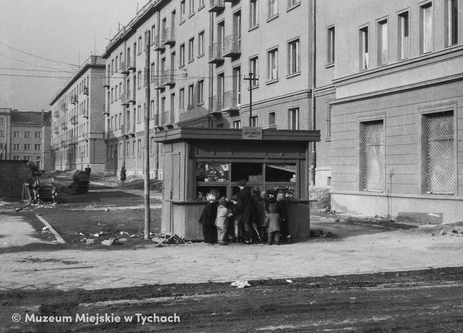 Kiosk spożywczy w okolicy placu Wincentego Pstrowskiego (obecnie świętej Anny). W tle budynki mieszkalne przy ulicy Arkadowej.