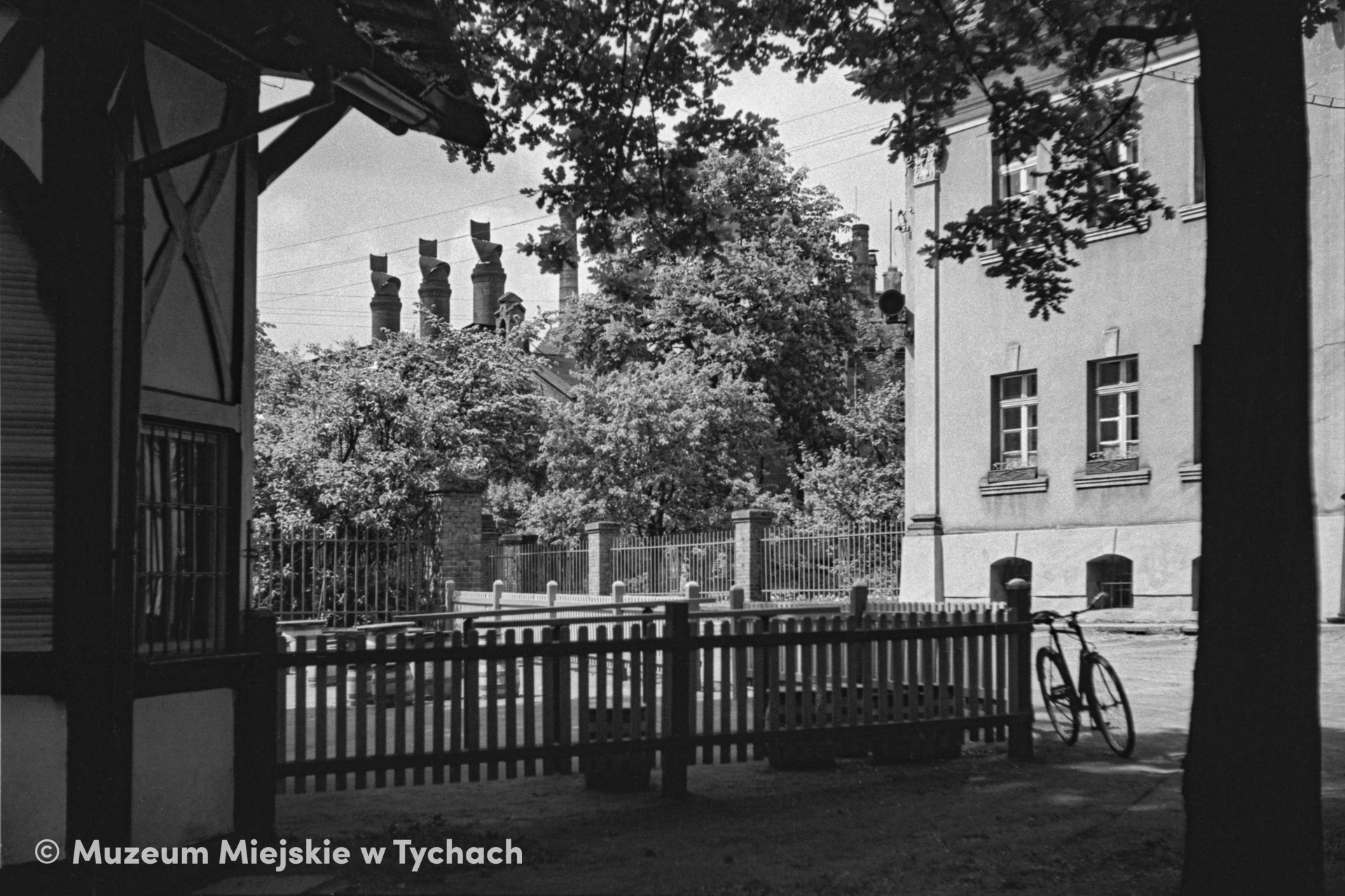 Fragment zespołu parkowo-pałacowego w pobliżu Browaru Książęcego przy ulicy Katowickiej. W latach 50. w pałacu mieścił się Dom Kultury, a w latach 60. przedszkole. W głębi kominy Browaru Książęcego.
