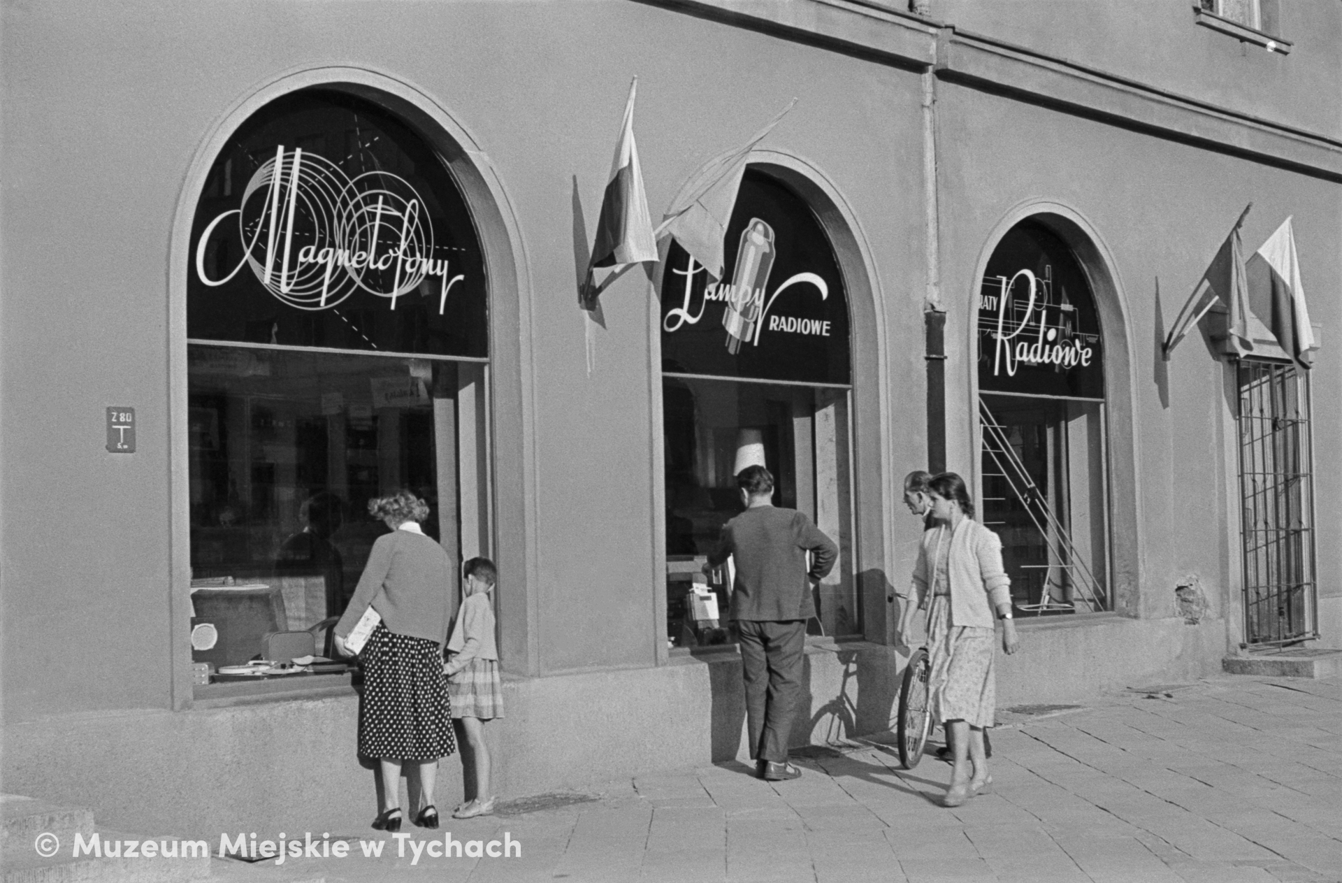 Mieszkańcy przed sklepem radiowo-telewizyjnym znajdującym się na parterze budynku mieszkalnego przy ulicy Bibliotecznej, w pobliżu placu Bolesłwa Bieruta (obecnie Krzysztofa Kamila Baczyńskiego).