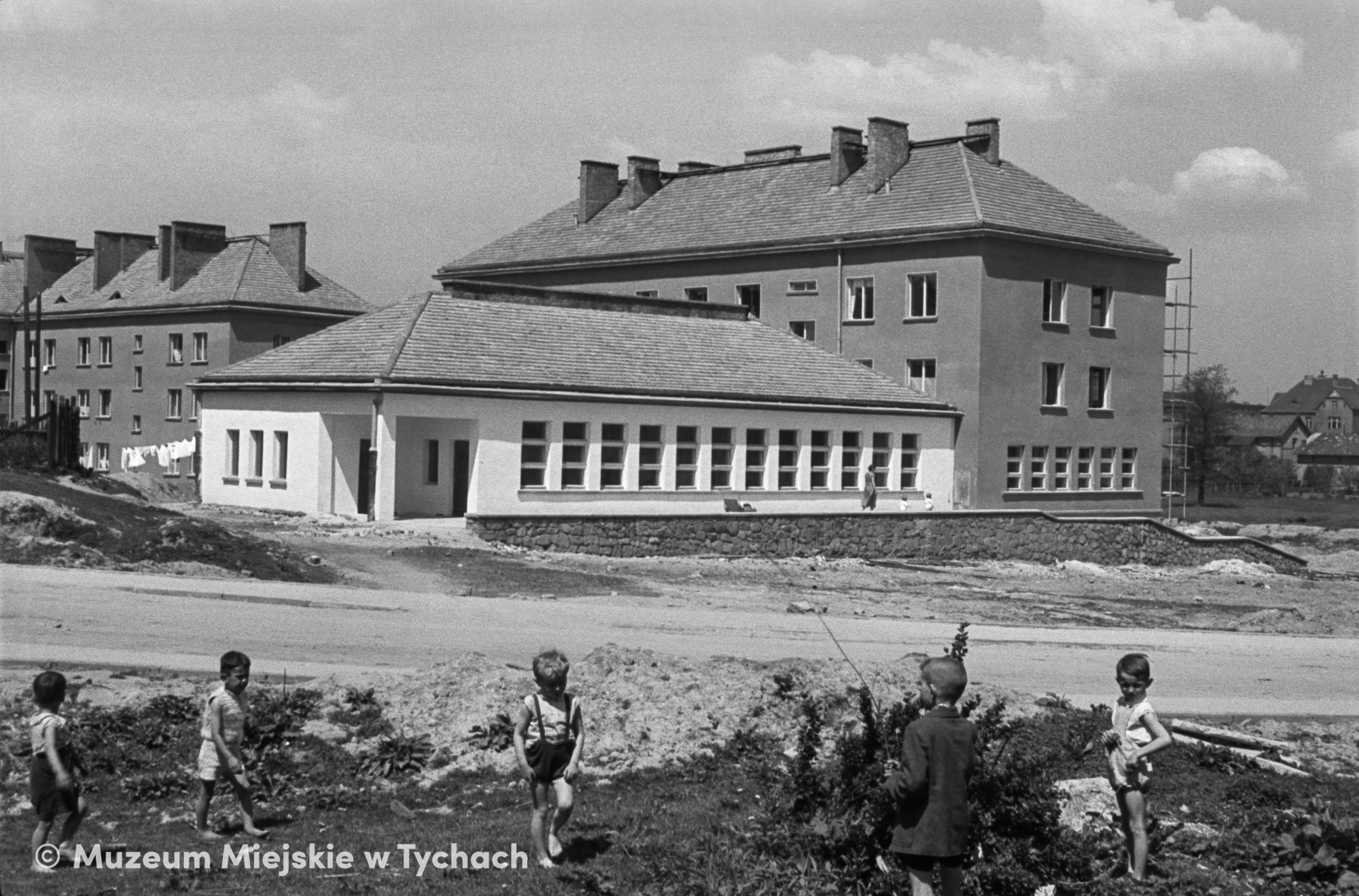 Widok od ulicy Braterskiej na wykańczany budynek przychodni lekarskiej przy alei A–B (obecnie ul. księdza kardynała Augusta Hlonda 69). Na pierwszym planie dzieci bawią się na nieuporządkowanym terenie wzdłuż ulicy.