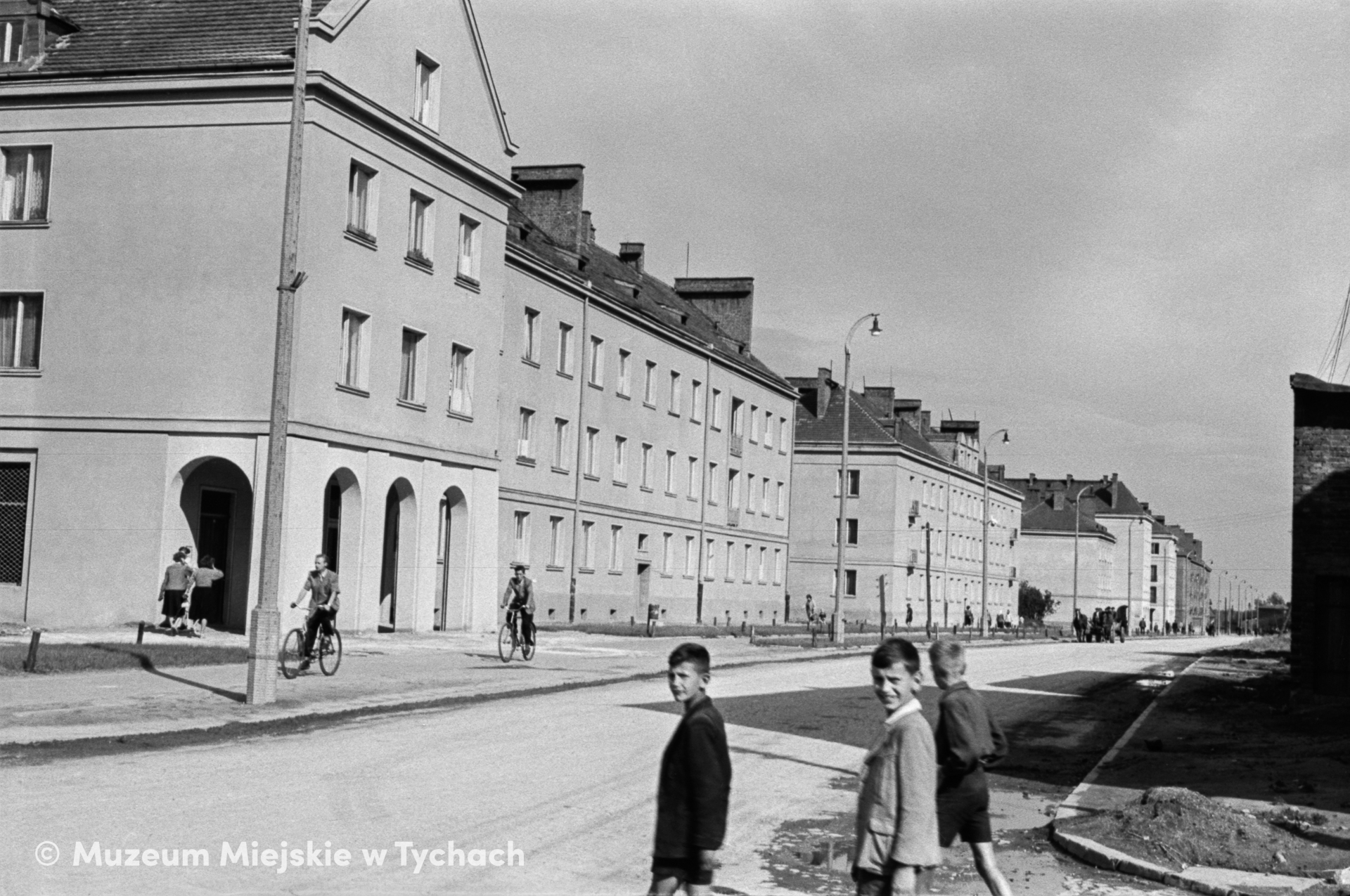 Widok na ulicę Budowlanych od zachodu, w kierunku alei Bielskiej. Budynki mieszkalne wzdłuż północnej strony ulicy.