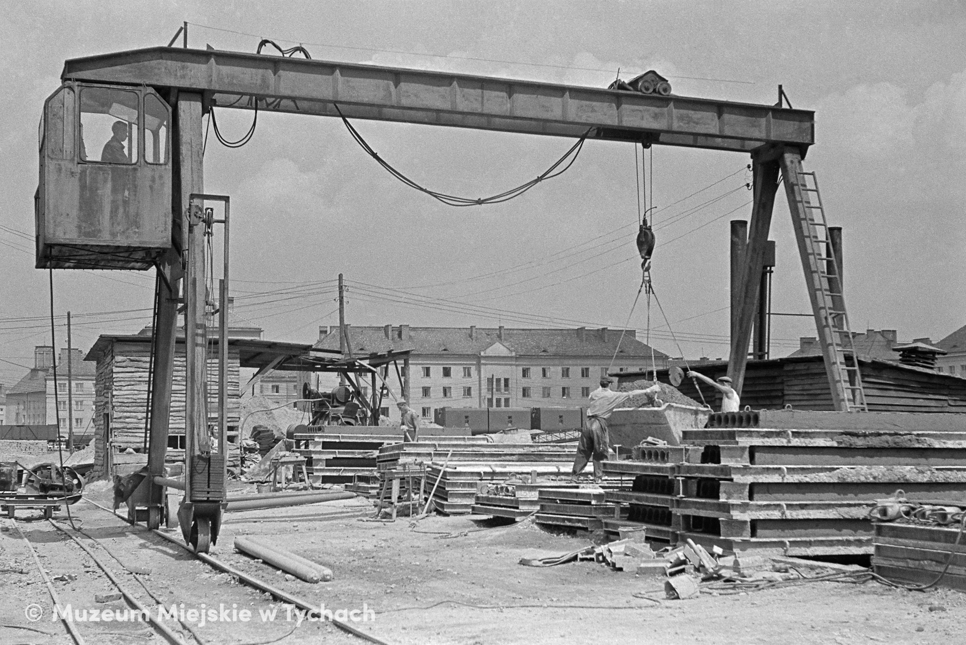 Suwnica do przenoszenia materiałów budowlanych oraz elementów prefabrykowanych. Budowlańcy kierują pojemnik z masą betonową nad formę do produkcji elementów prefabrykowanych. Zdjęcie wykonane na terenie zakładu prefabrykacji. W głębi budynek Hotelowca przy ulicy Budowlanych.
