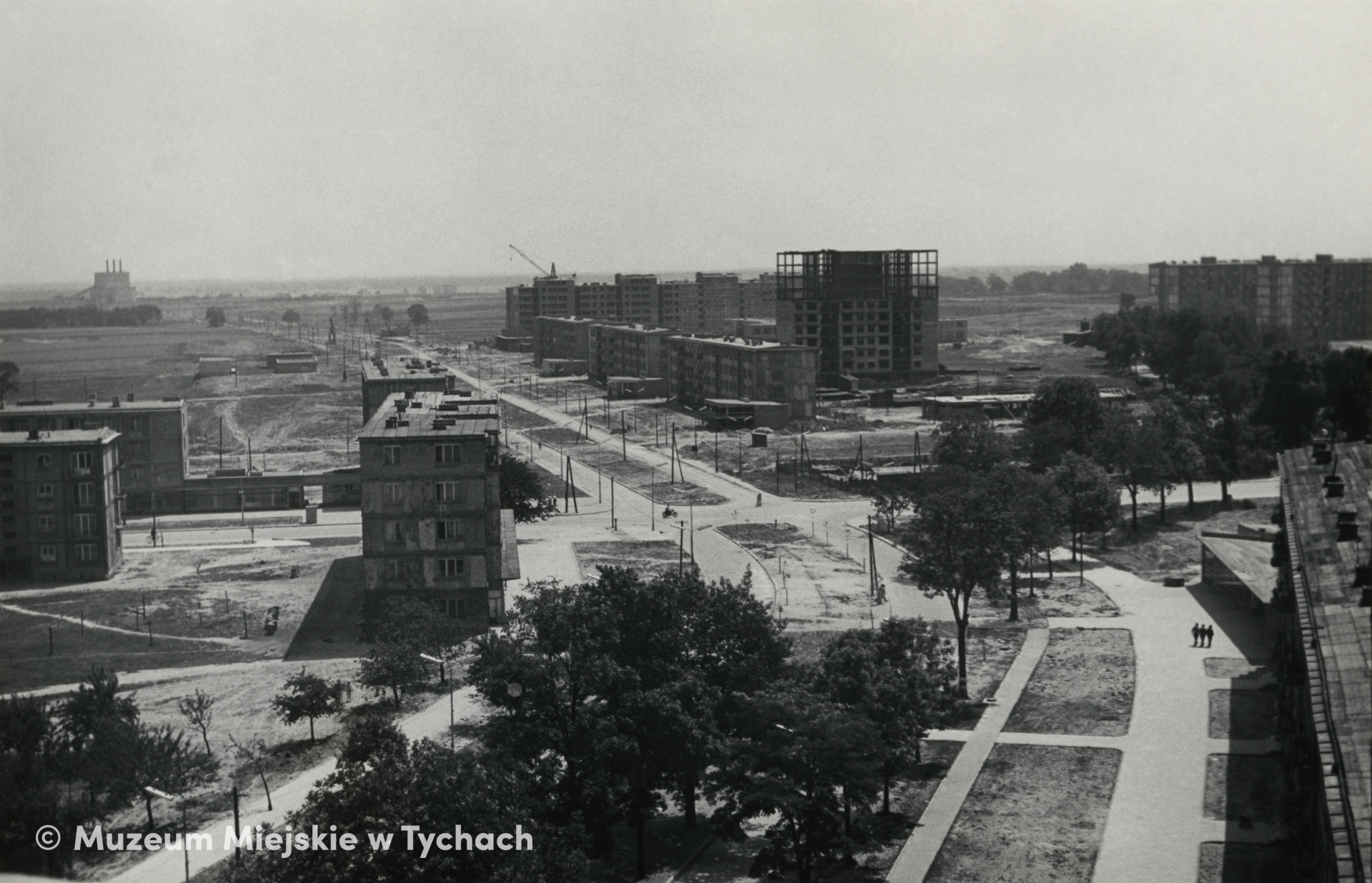 Widok z góry na ulicę Paprocańską (od 1968 do 1989 roku aleję Rewolucji Październikowej, dziś aleję Niepodległości). Na zdjęciu fragmenty zabudowy na osiedlach C, D i E. W oddali budynek Elektrociepłowni.