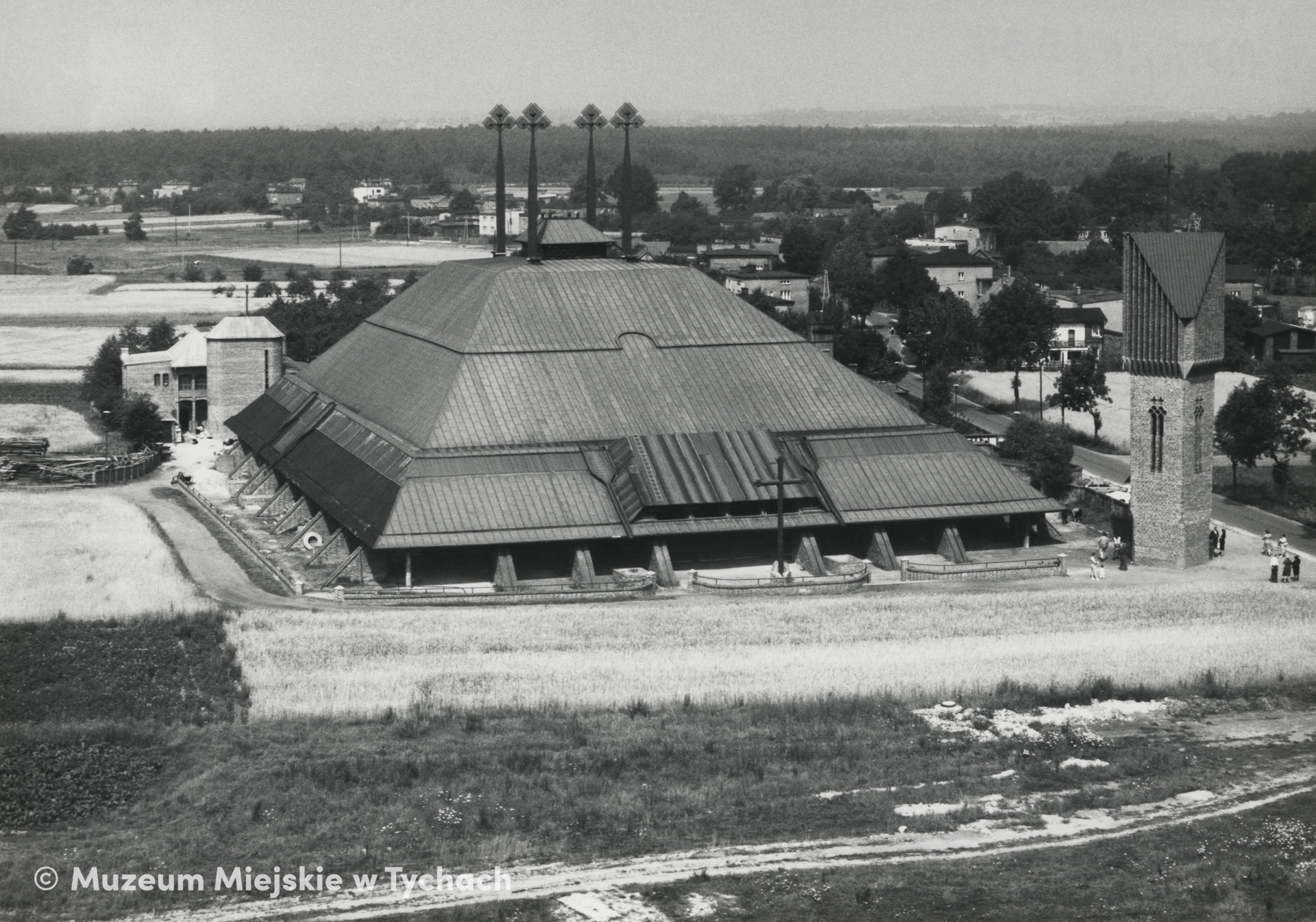 Budynek kościoła pw. Ducha Świętego otoczony polami uprawnymi. Głównym projektantem świątyni był Stanisław Niemczyk, a za malowidła we wnętrzu kościoła, wykonane bezpośrednio na drewnianych deskach, odpowiadał Jerzy Nowosielski. Kościół usytuowany nieopodal zabudowy jednorodzinnej w Żwakowie, widok od wschodu.