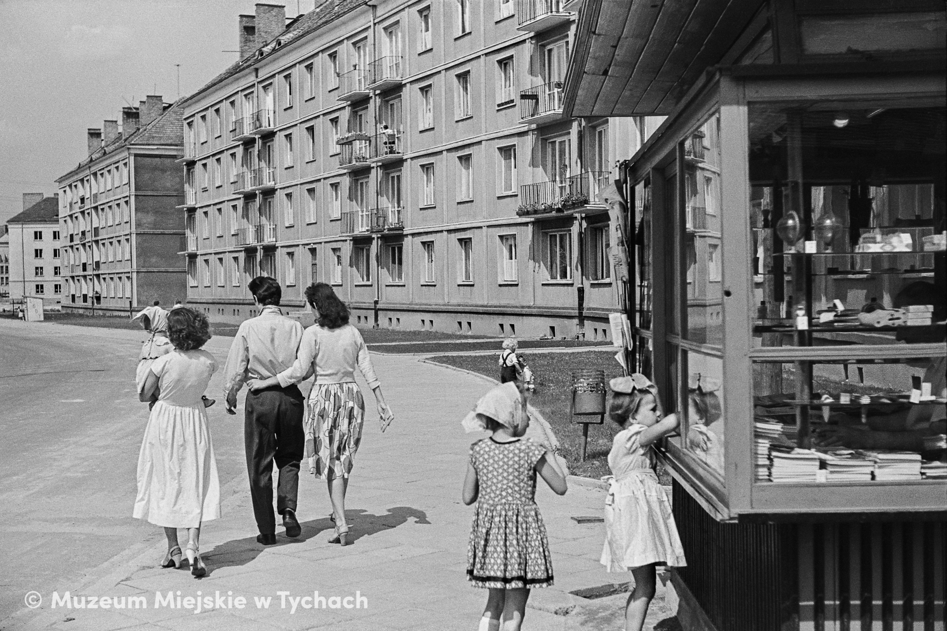 Budynki mieszkalne i kiosk Ruchu przy ulicy Stefana Czarnieckiego. Grupa mieszkańców na letnim spacerze.