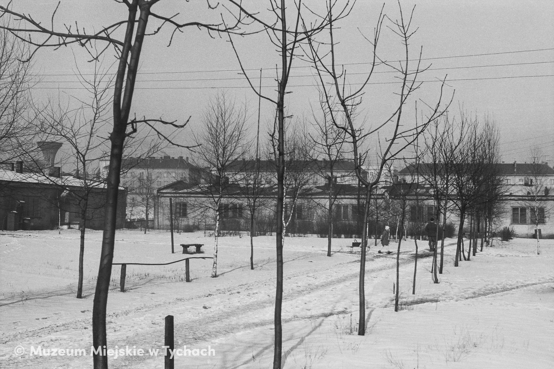 Ośnieżone przestrzenie między budynkami w miasteczku barakowym – hotelu dla robotników budujących osiedla A, B i C. W głębi widoczne budynki mieszkalne przy ulicy Wojska Polskiego na osiedlu A. Tymczasowe miasteczko utworzono z baraków ustawionych wzdłuż Potoku Browarnianego. W miasteczku mieściła się sala klubowa oraz kino Budowniczy. Baraki zostały ostatecznie rozebrane około 1966 roku, a w ich miejscu wzniesiono gmach Zakładu Elektroniki Górniczej.
