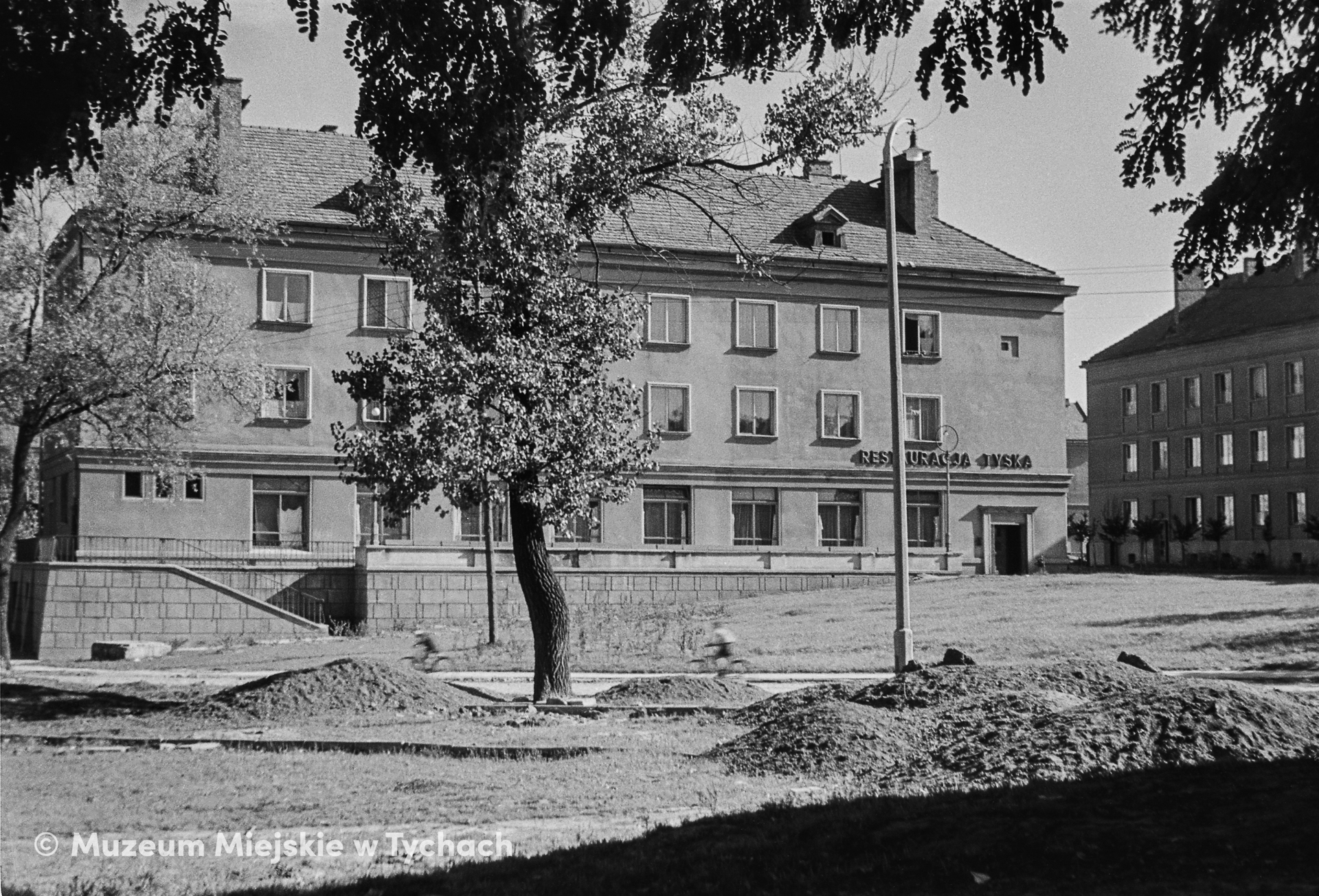 Budynek mieszkalny przy ulicy Bolesława Bieruta (obecnie Stefana Batorego) z ulokowaną na parterze restauracją Tyską. Przed budynkiem taras i porządkowane otoczenie.