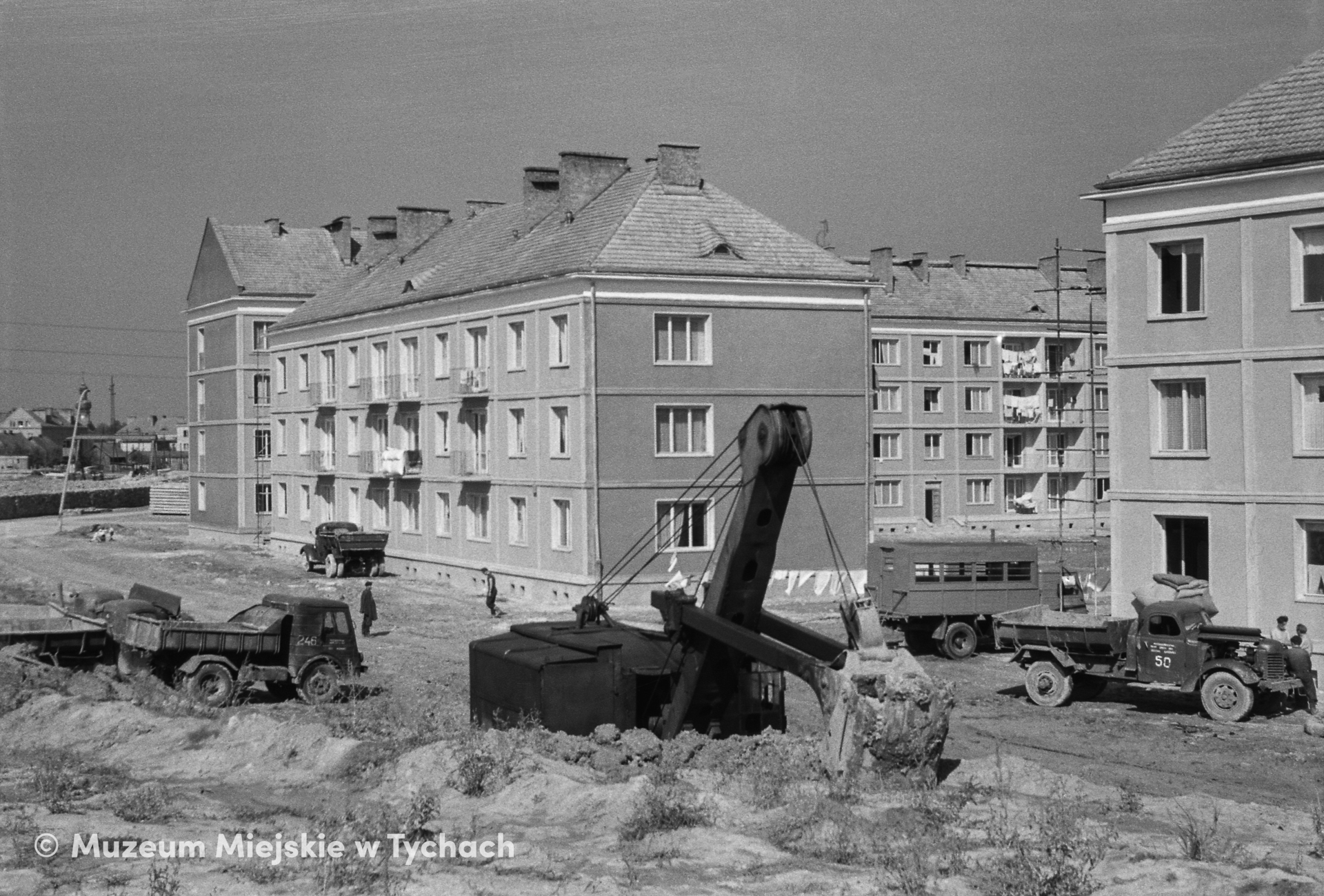 Budynki mieszkalne przy ulicy Czereśniowej, w pobliżu stoją samochody ciężarowe Star i Ził oraz koparka gąsienicowa.