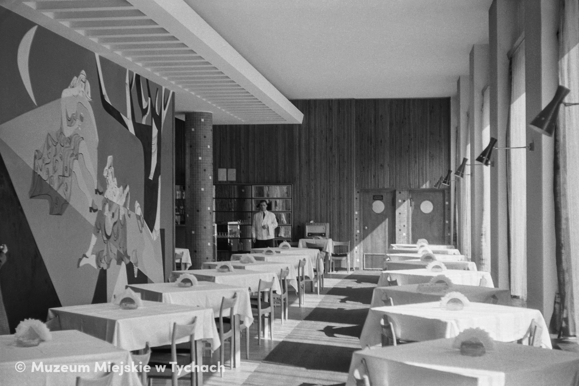 Wnętrze restauracji Mimoza. Restauracja mieściła się na parterze budynku mieszkalnego położonego w północnej pierzei placu Bolesława Bieruta (obecnie Krzysztofa Kamila Baczyńskiego). W budynku znajdowały się także kawiarnia Mimoza, kino Andromeda i księgarnia.