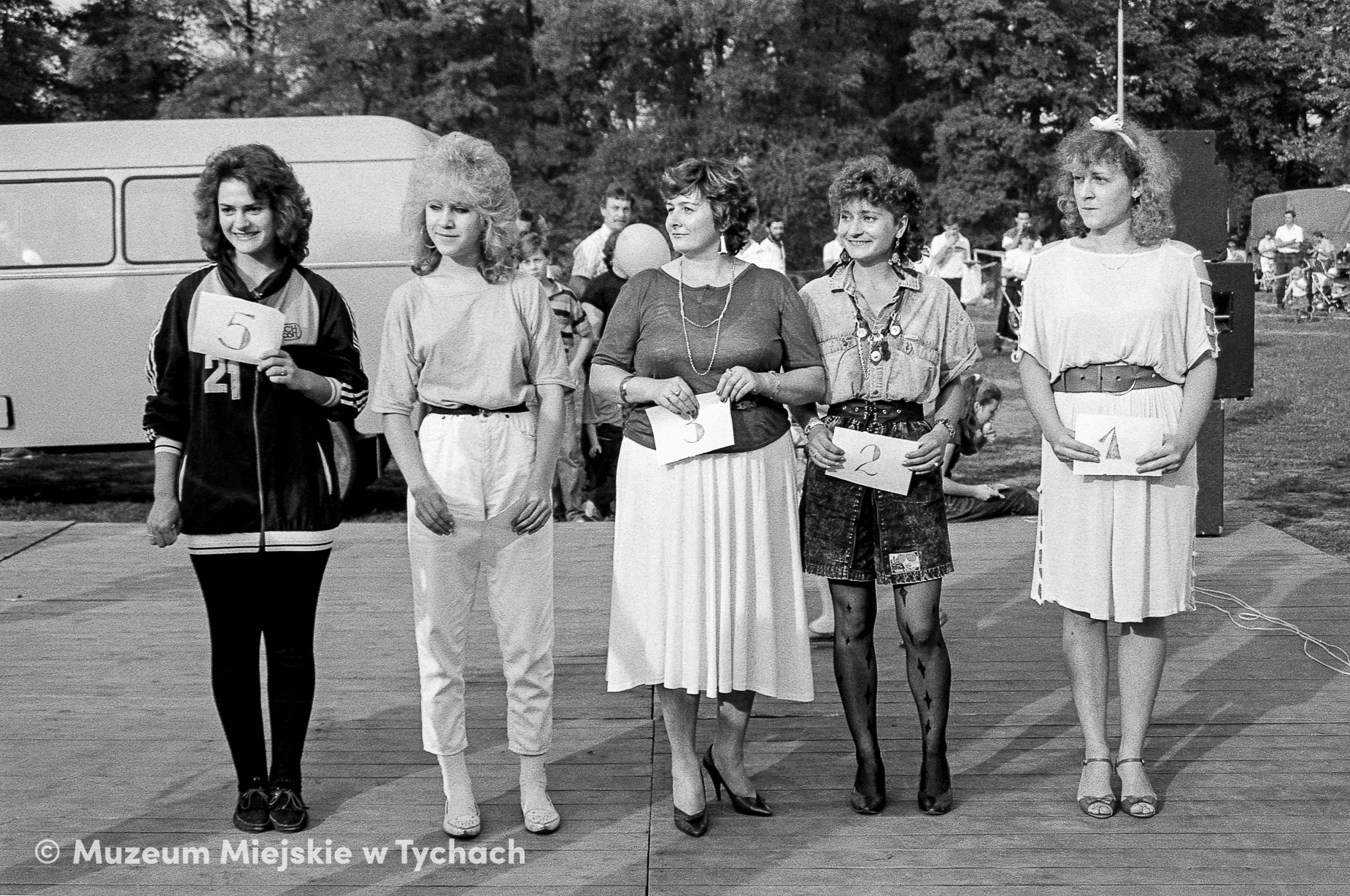 Festyn sportowo-rekreacyjny zorganizowany przez Solidarność na terenie stadionu przy obecnej ulicy gen. Władysława Andersa. Prezentacja kandydatek w trakcie wyborów miss festynu.