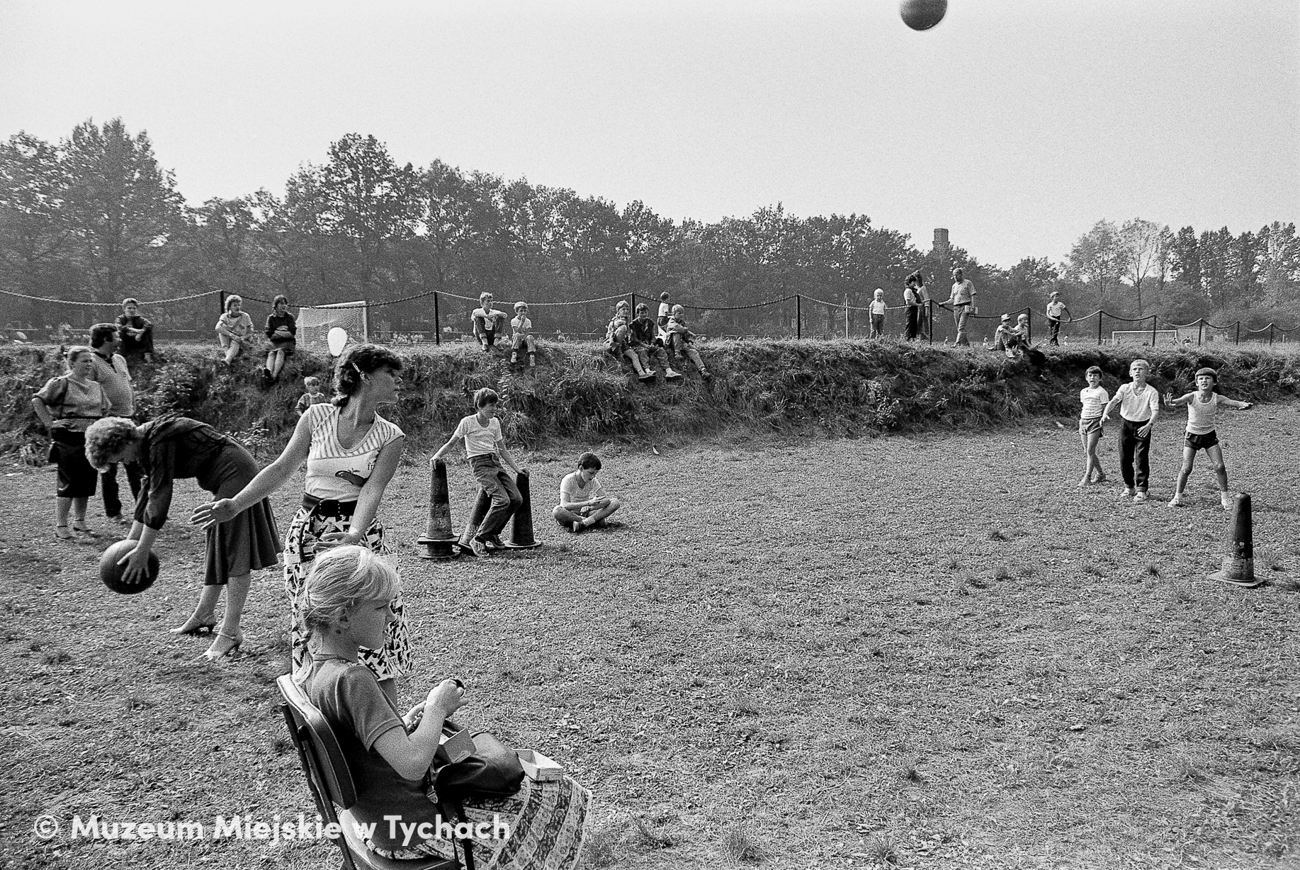 Festyn sportowo-rekreacyjny zorganizowany przez Solidarność na terenie stadionu przy obecnej ulicy gen. Władysława Andersa. Konkurs sprawnościowy dla kobiet w rzucie piłką lekarską, towarzyszy im kibicująca młodzież.