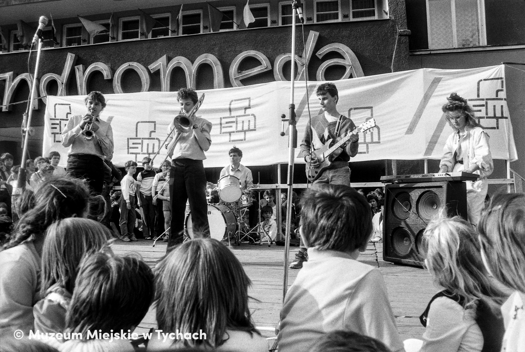 Festyn pierwszomajowy na placu Bolesława Bieruta (obecnie Krzysztofa Kamila Baczyńskiego) na osiedlu B. Przed kinem Andromeda trwa występ muzyczny zespołu młodzieżowego. Za muzykami rozciągnięty baner z logotypem FSM – Fabryki Samochodów Małolitrażowych.