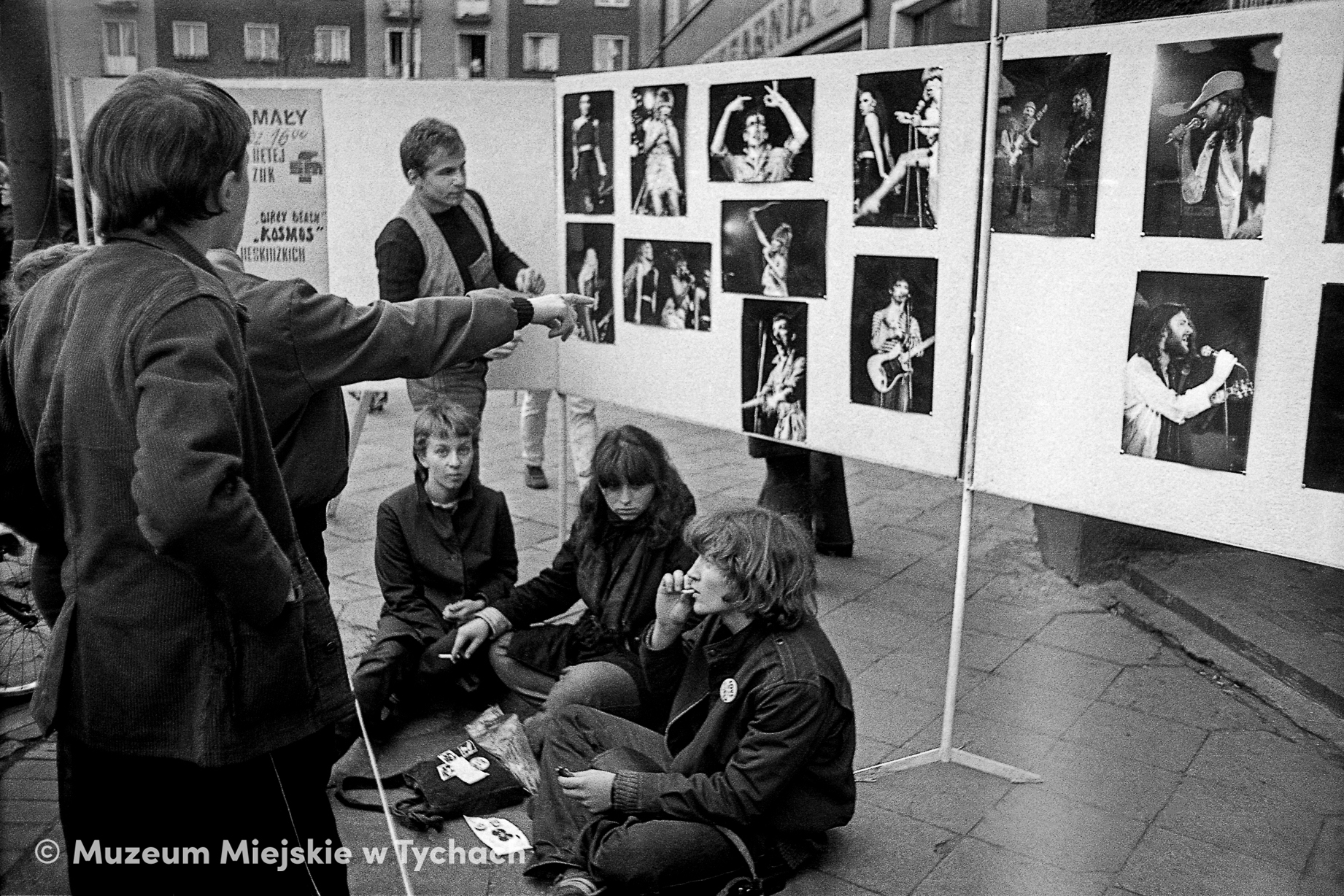 Festyn pierwszomajowy na placu Bolesława Bieruta (obecnie Krzysztofa Kamila Baczyńskiego). Wystawa planszowa z fotografiami przedstawiającymi muzyków, m.in. Ryszarda Riedla. Mężczyźni oglądają zdjęcia, pod planszami na chodniku siedzi grupka młodzieży.