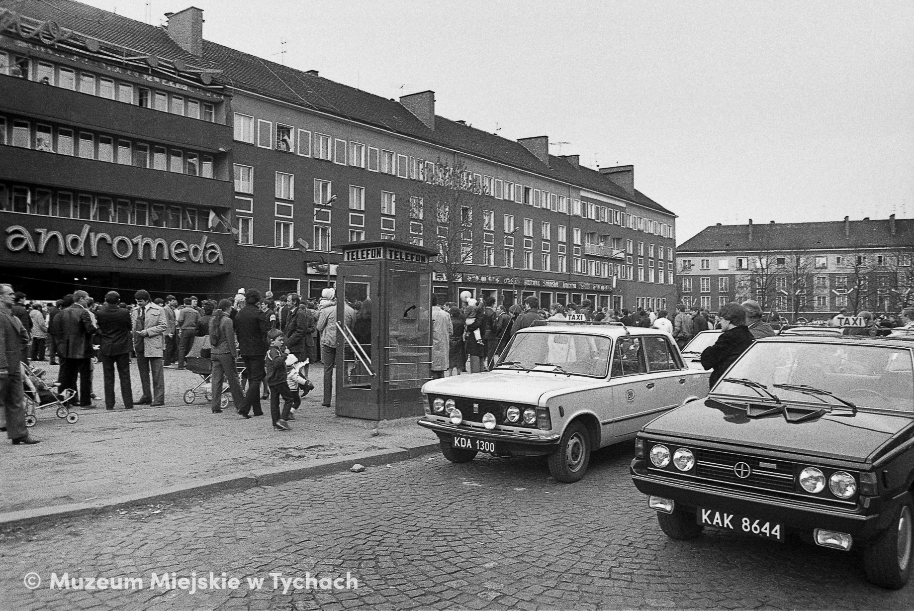 Festyn pierwszomajowy na placu Bolesława Bieruta (obecnie Krzysztofa Kamila Baczyńskiego). Mieszkańcy zgromadzeni przed kinem Andromeda, na chodniku obok budki telefonicznej. Na jezdni zaparkowane taksówki – fiat 125p i polonez.