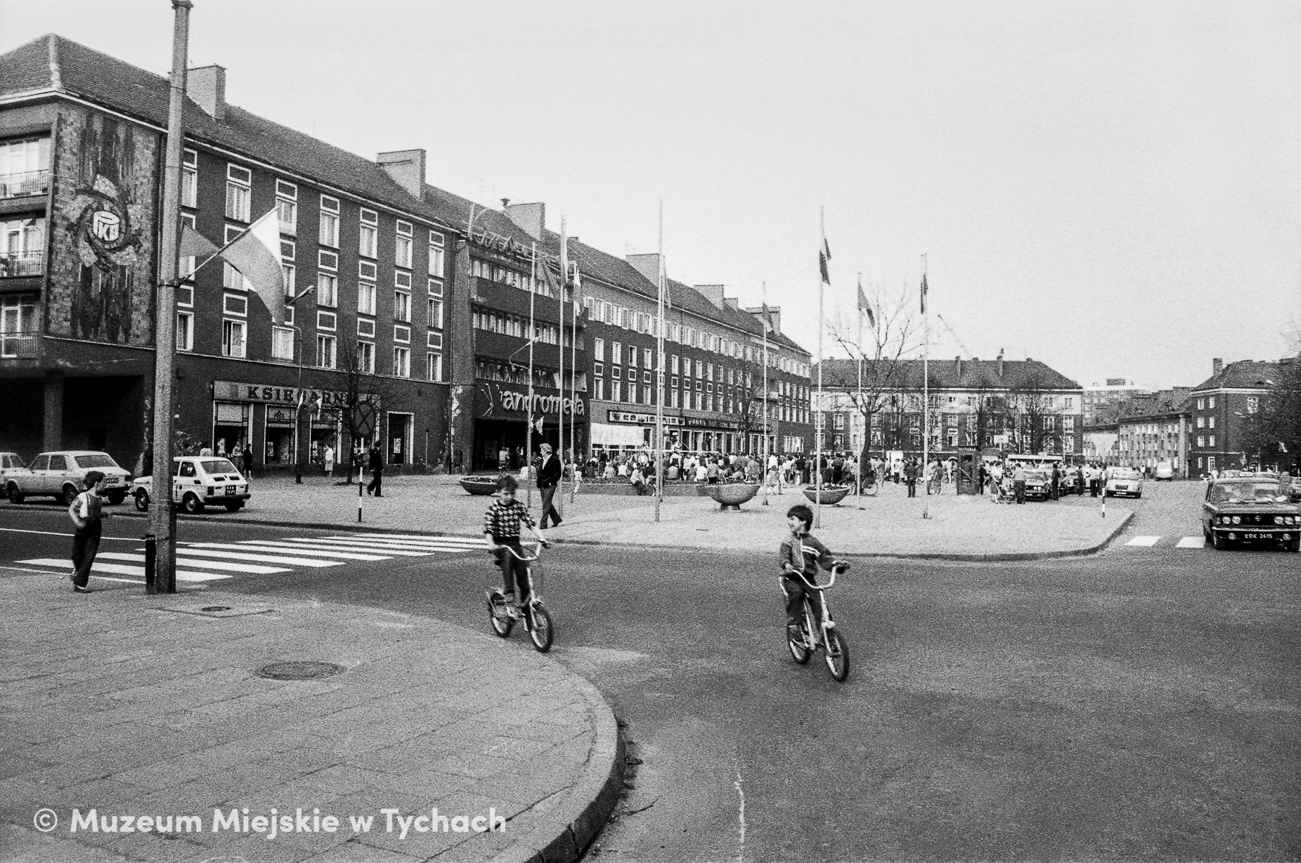 Plac Bolesława Bieruta (obecnie Krzysztofa Kamila Baczyńskiego). Dzieci na składakach jadą ulicą Mariana Buczka (obecnie o. Innocentego Bocheńskiego). W tle budynek mieszkalny w północnej pierzei placu zdobiony mozaiką autorstwa Leona Swadźby (logo PKO). W jego części parterowej mieściły się kino Andromeda, księgarnia, kawiarnia i resturacja Mimoza. Przed kinem ustawiona scena, występy obserwuje zgromadzony tłum. W głębi budynki mieszkalne przy ulicach Bibliotecznej i Bolesława Bieruta (obecnie Stefana Batorego).